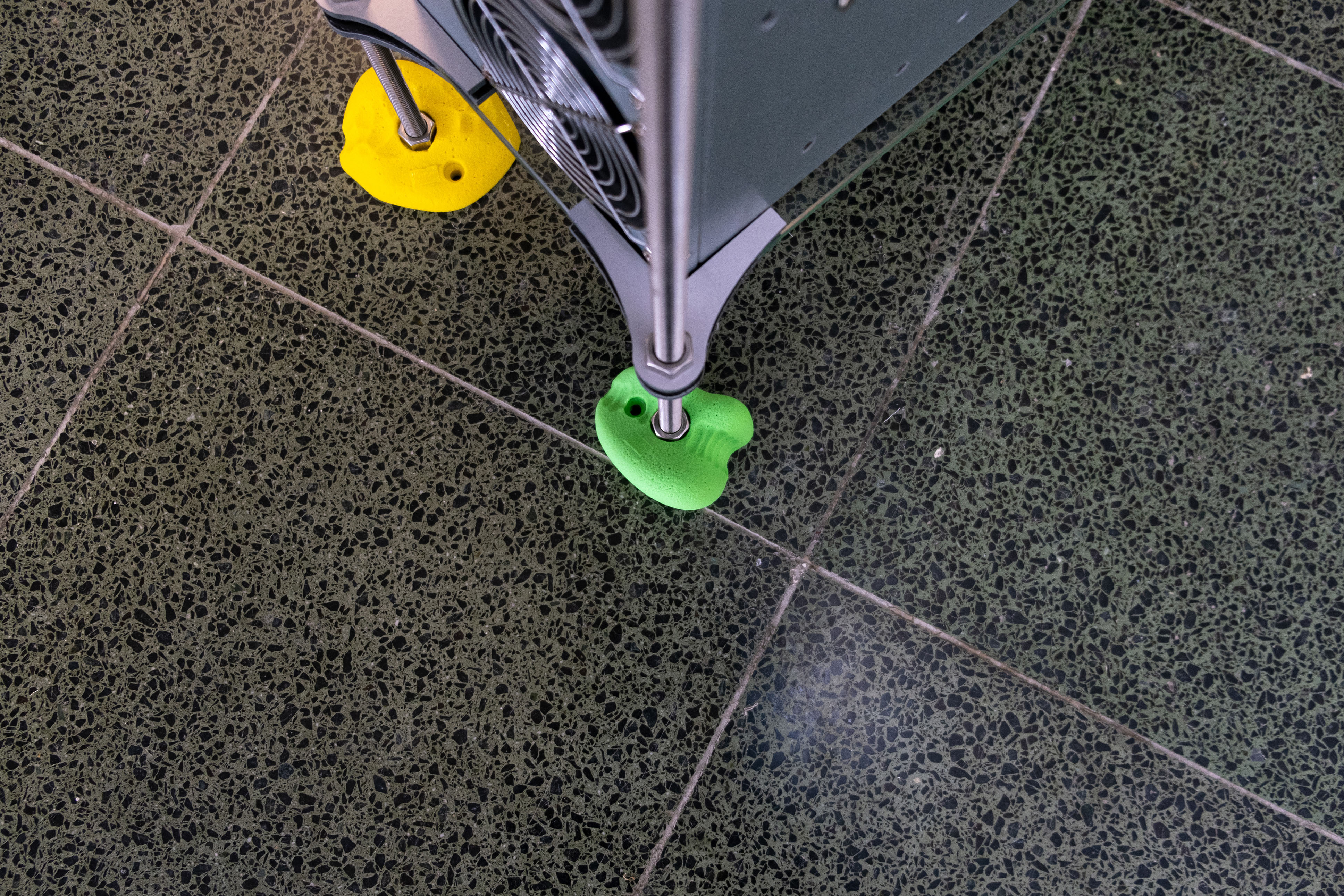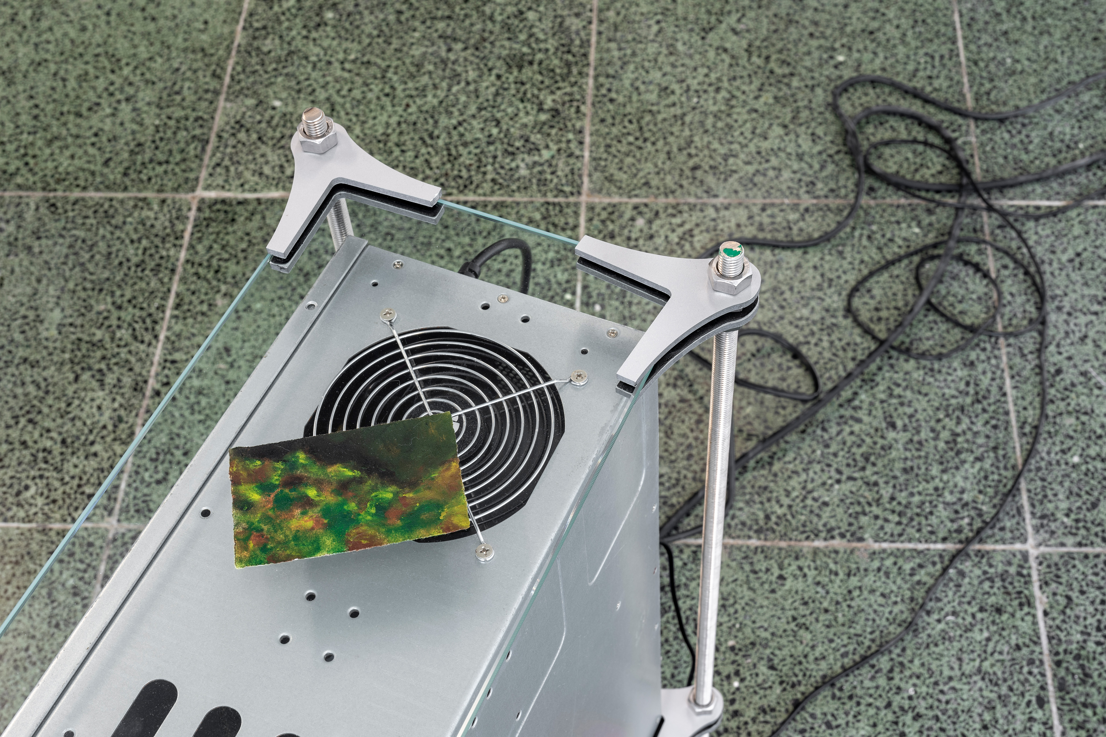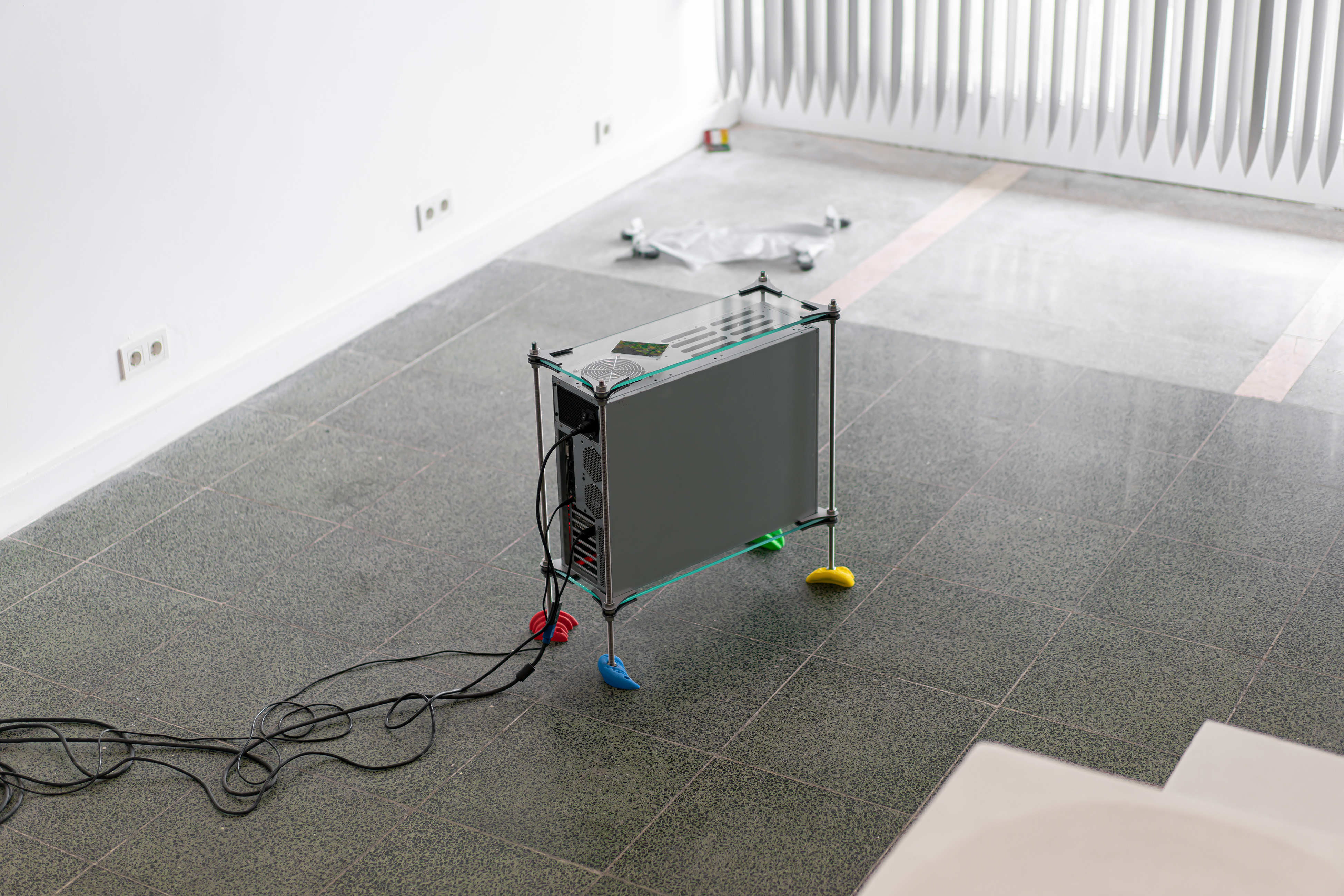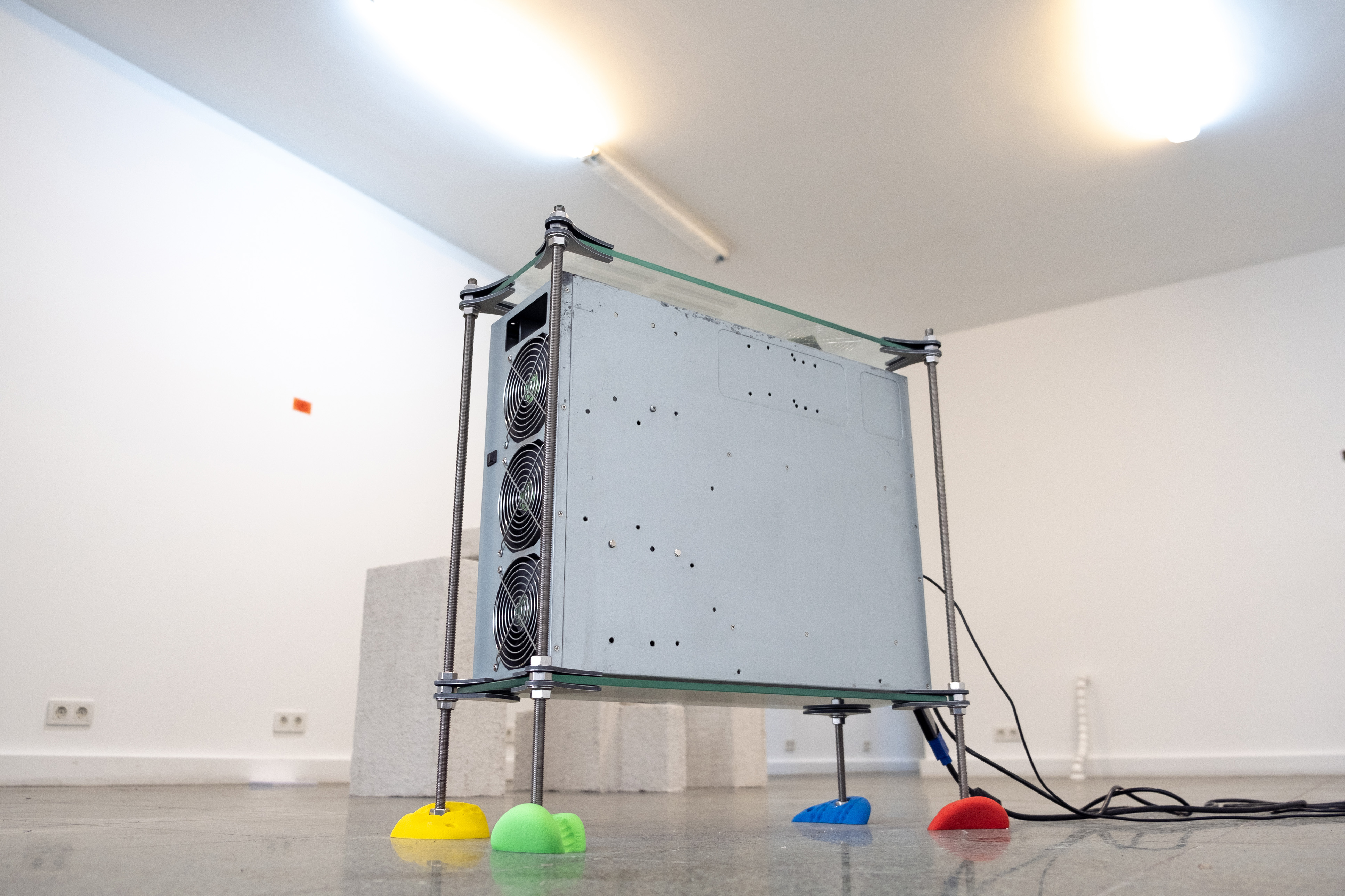 Case, Keyboard, Winter, 2021. Computer case, polyester climbing wall stones, glass, stainless rod, aluminum composite, 1/2, 21 x 60 x 54 cm