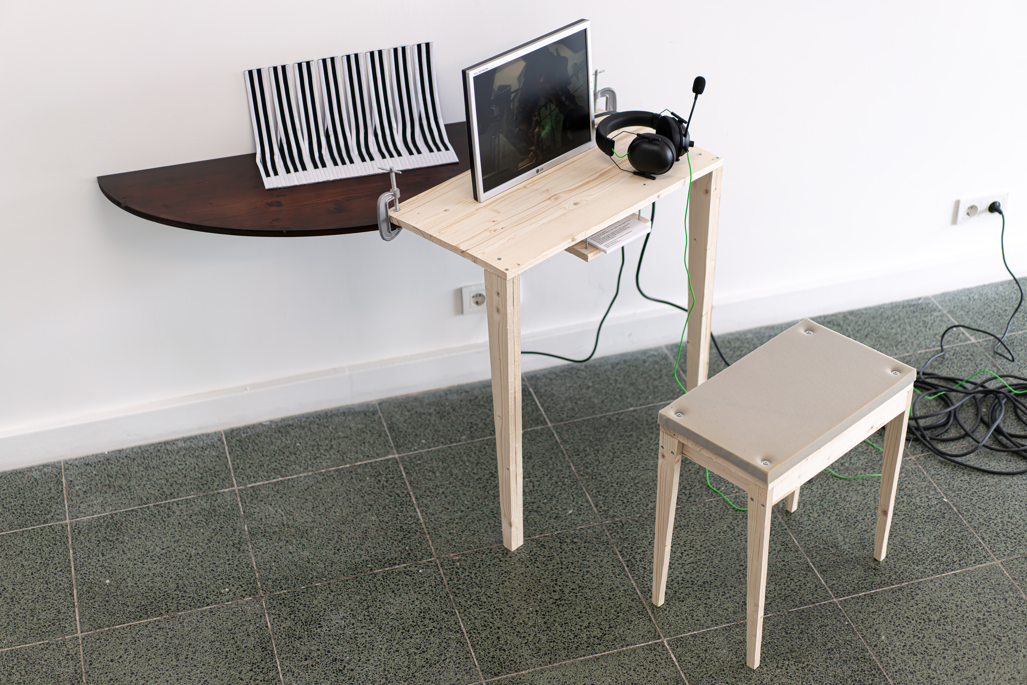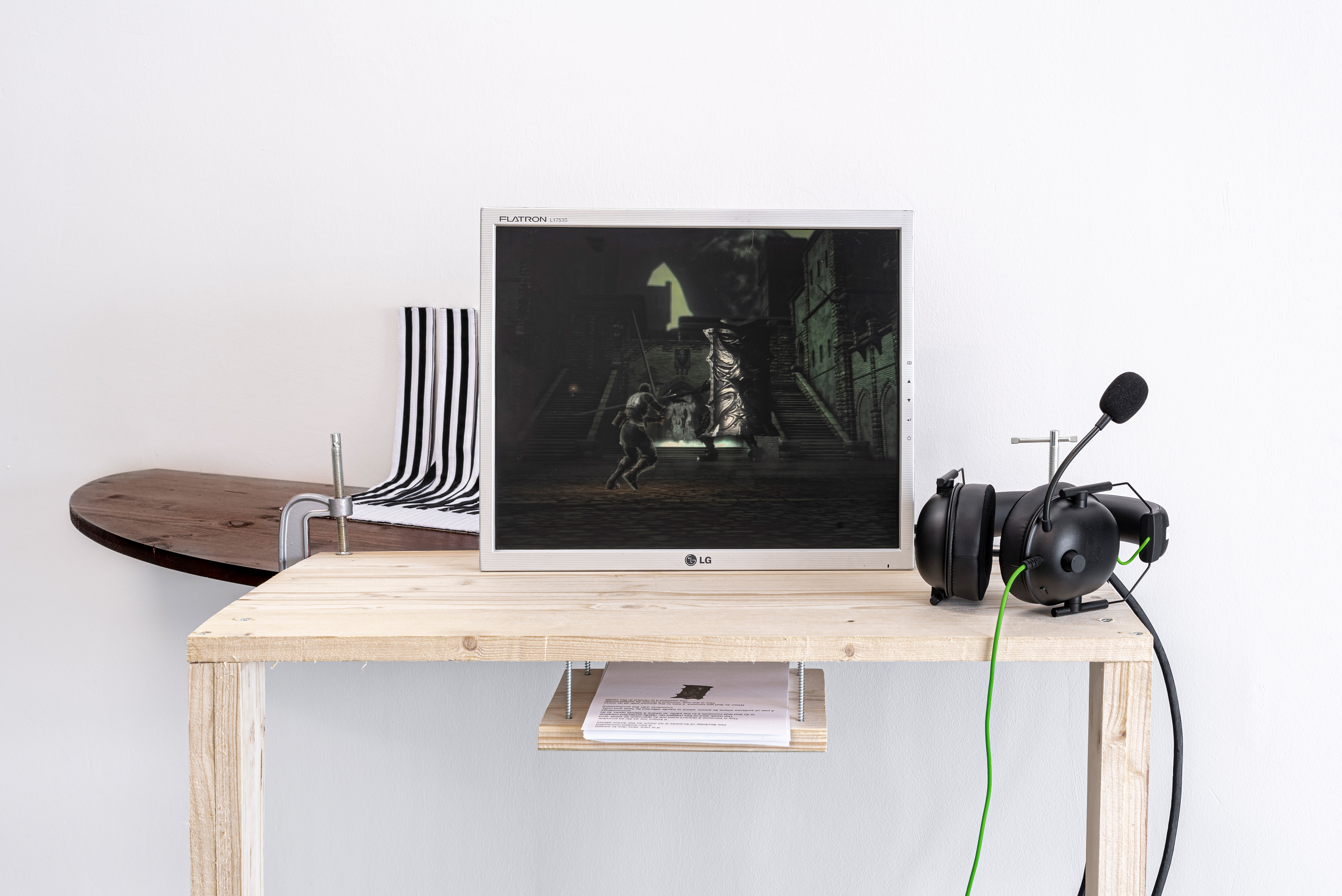 Case, Keyboard, Winter, 2021. "Adidas" tracksuit, CNC cut varnished and sanded spruce - Single-channel video 3'45 (Recording from the gameplay "Demon’s Souls" through the artist's character), monitor, player headset, jigsaw cut raw spruce, sponge, 2/2 150 x 100 x 90 cm