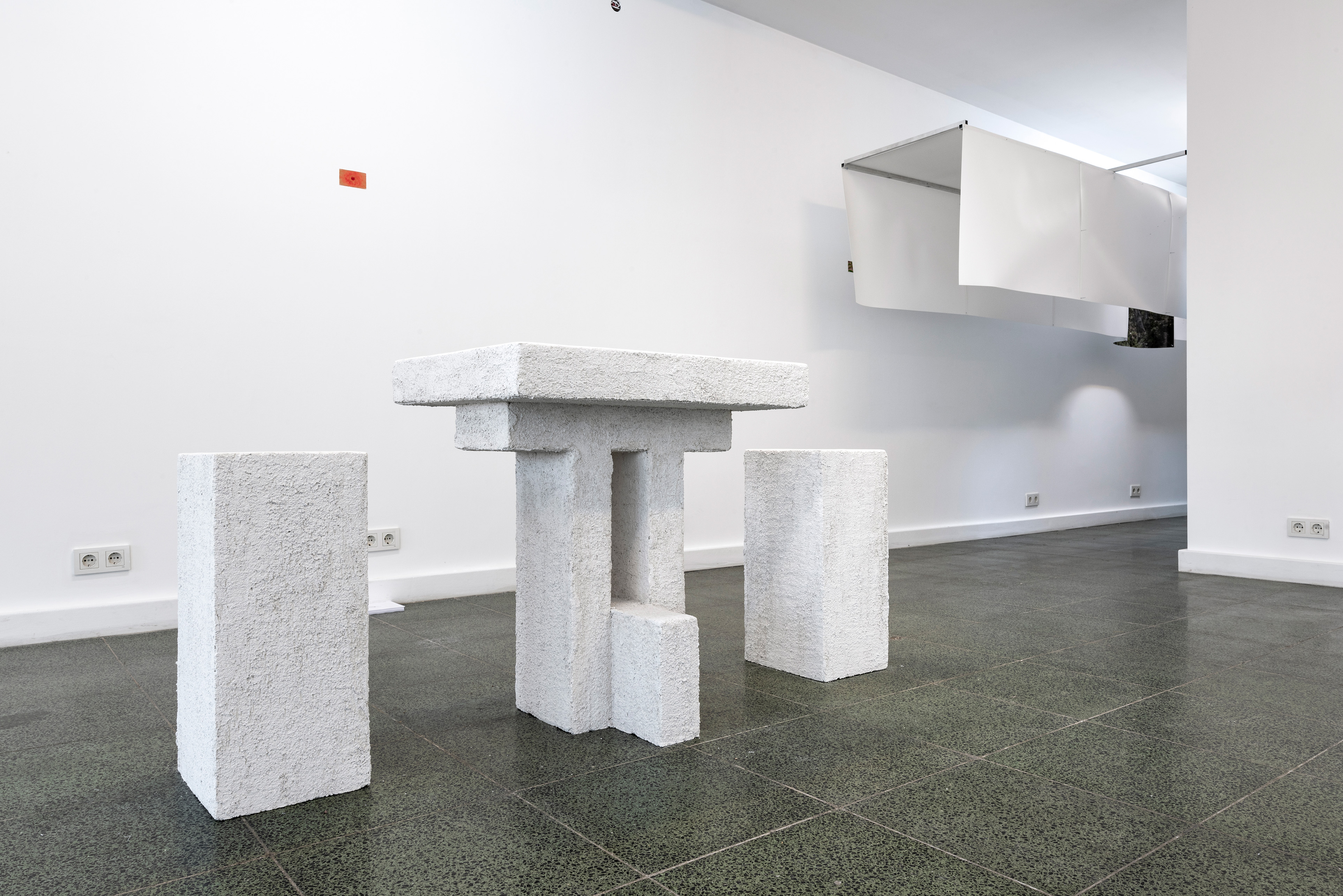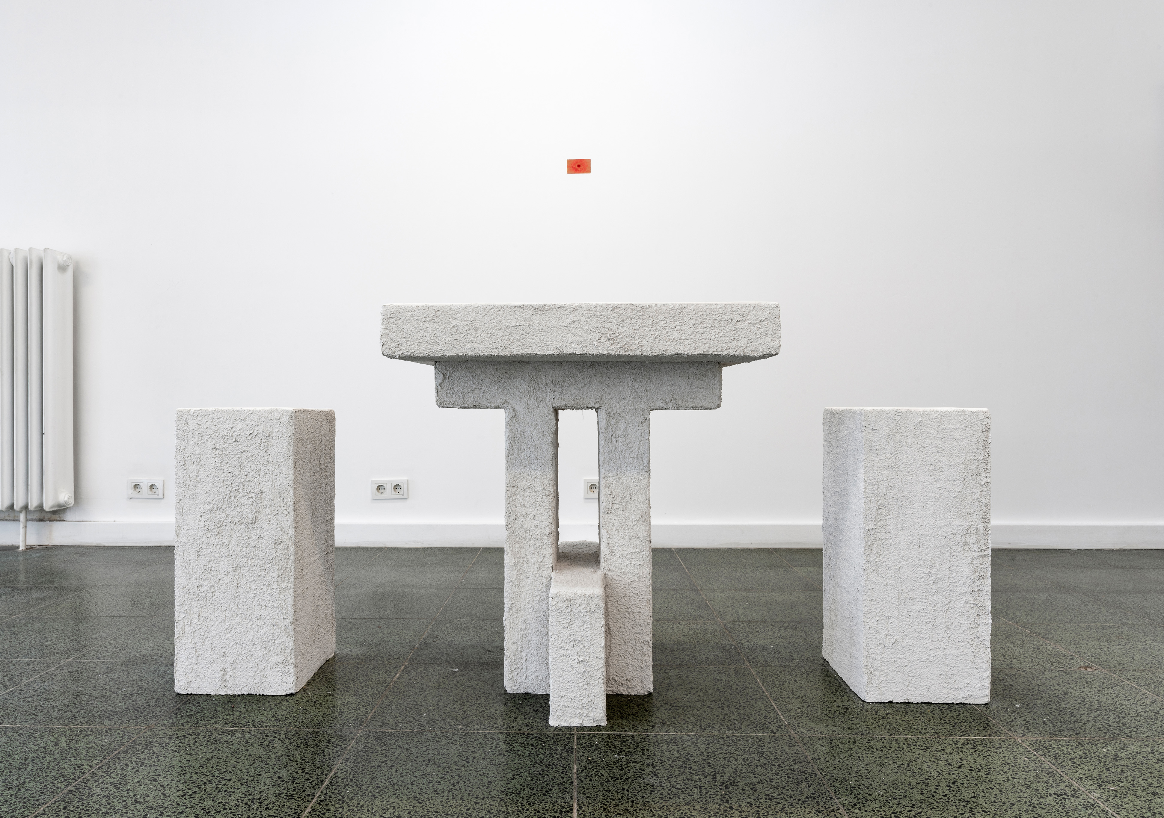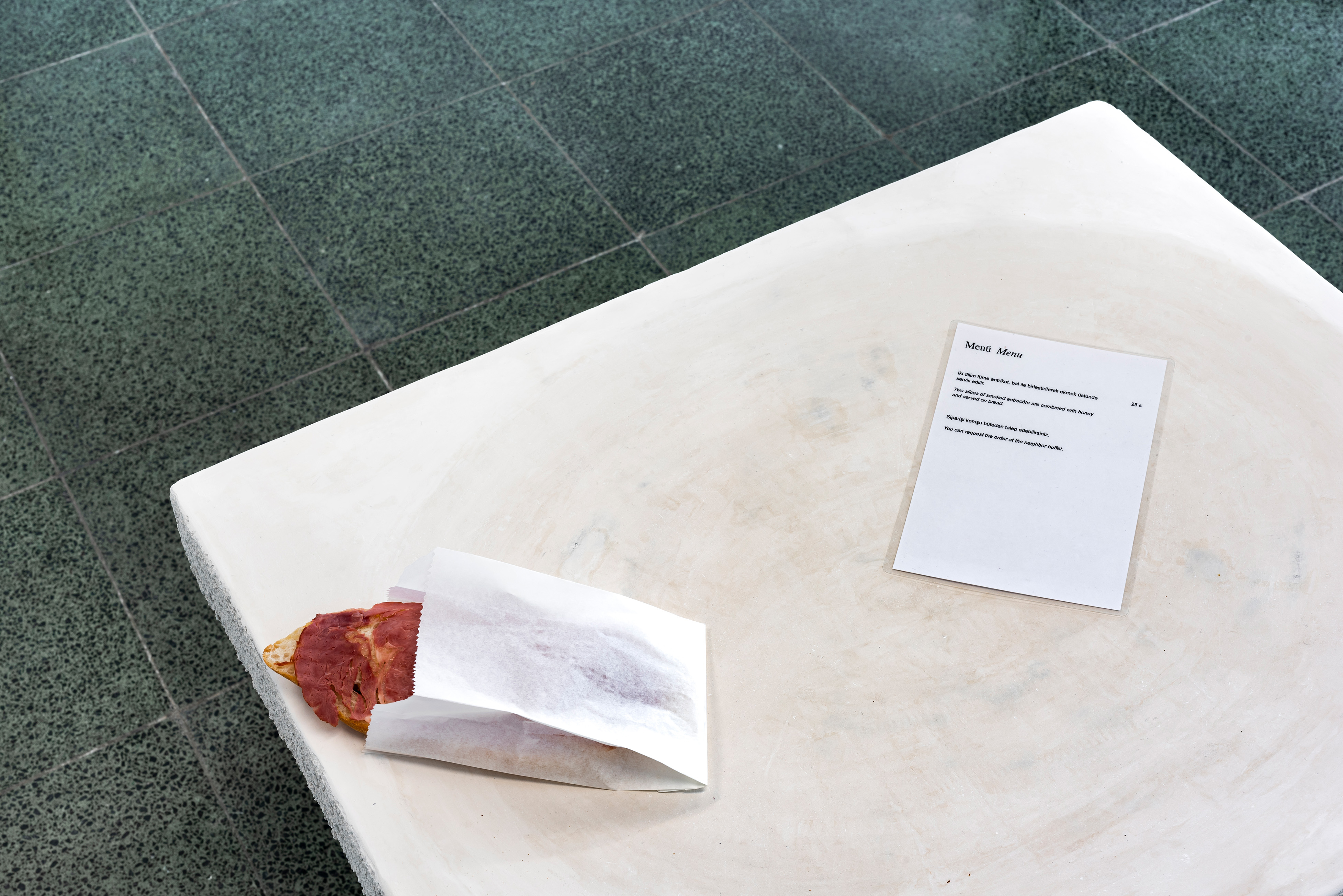 Menu, 2021. Decorative and satin plaster applied on autoclaved aerated concrete, honey, smoked entrecote, and bread, 140 x 55 x 80 cm