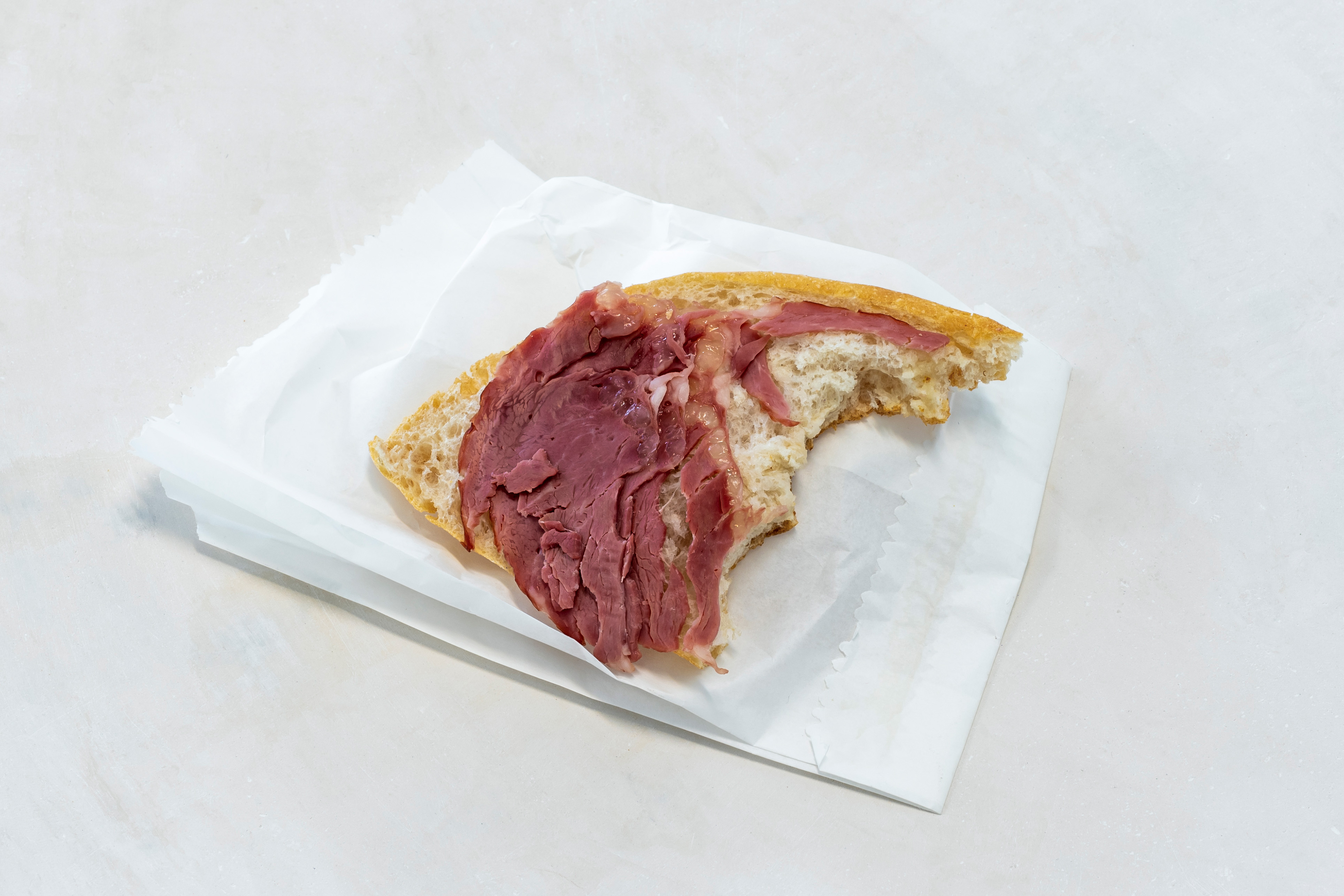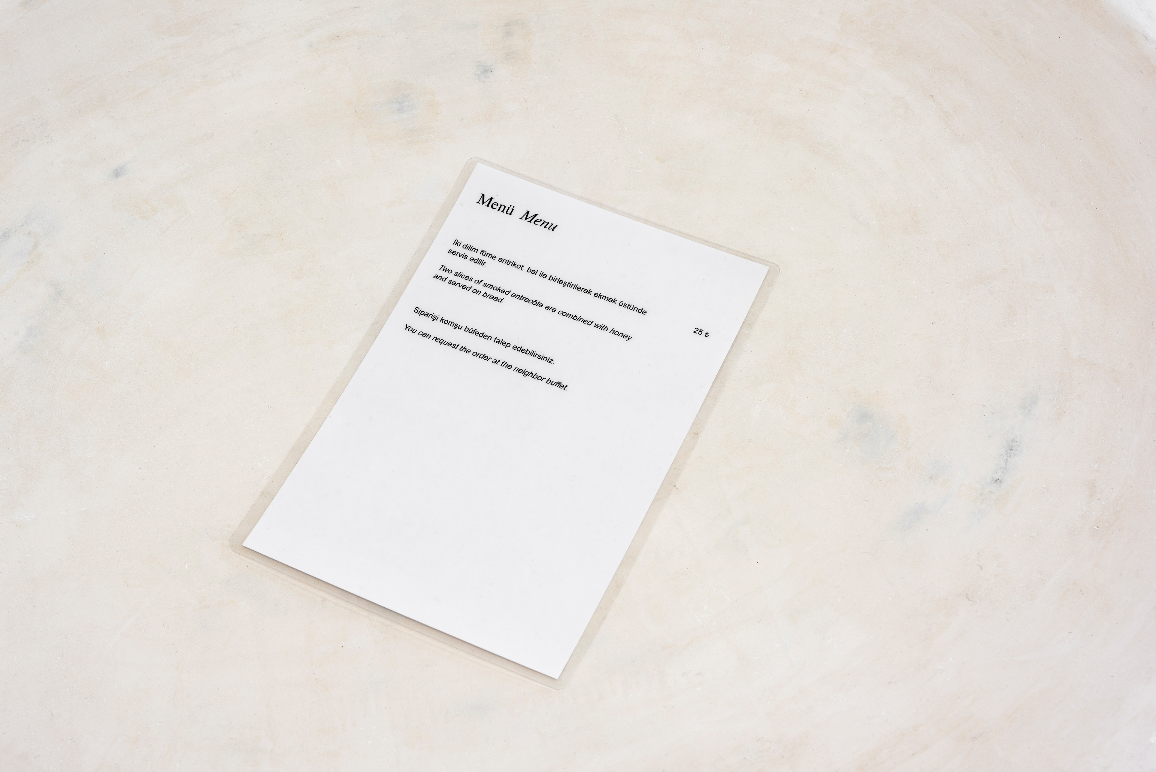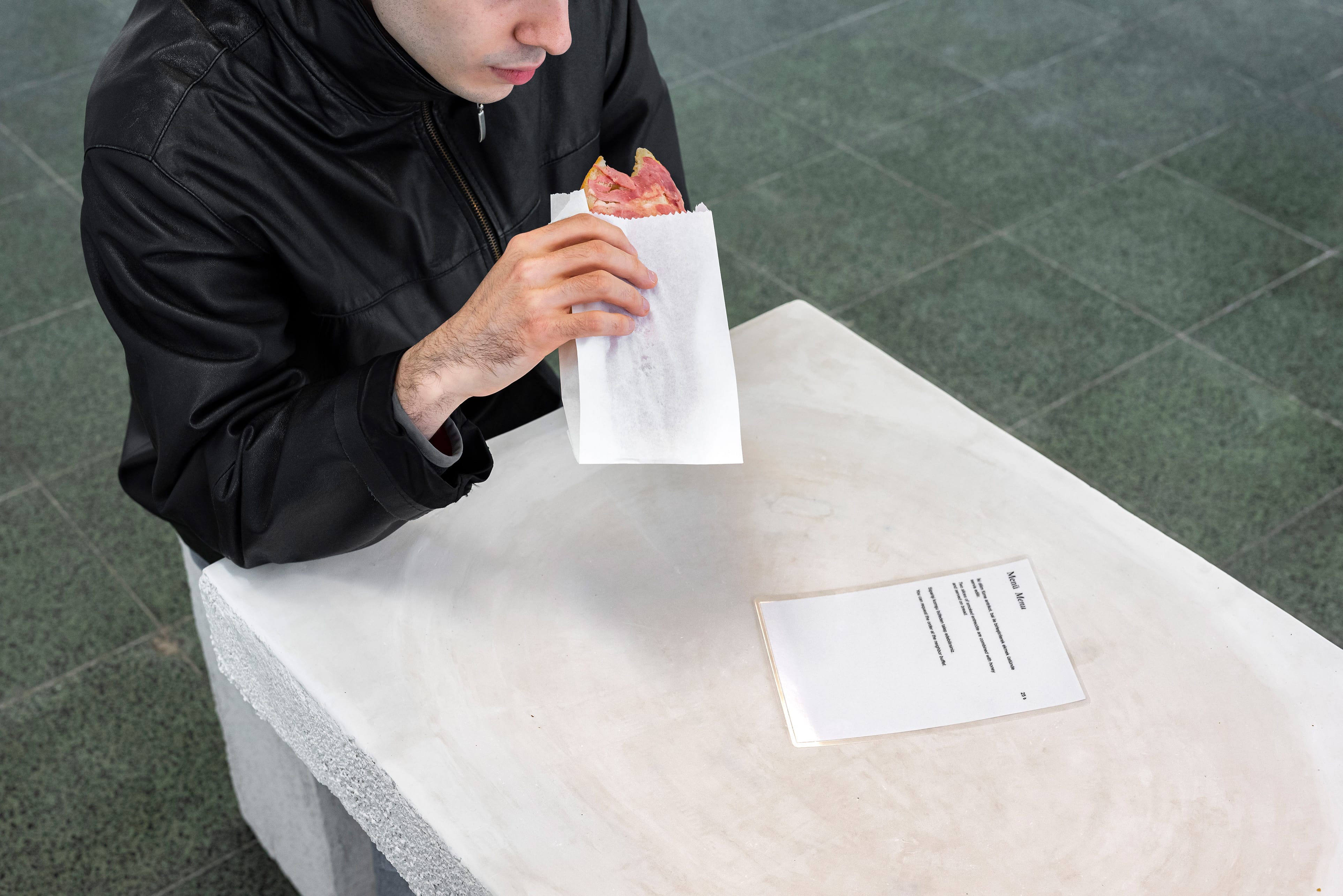 Menu, 2021. Decorative and satin plaster applied on autoclaved aerated concrete, honey, smoked entrecote, and bread, 140 x 55 x 80 cm