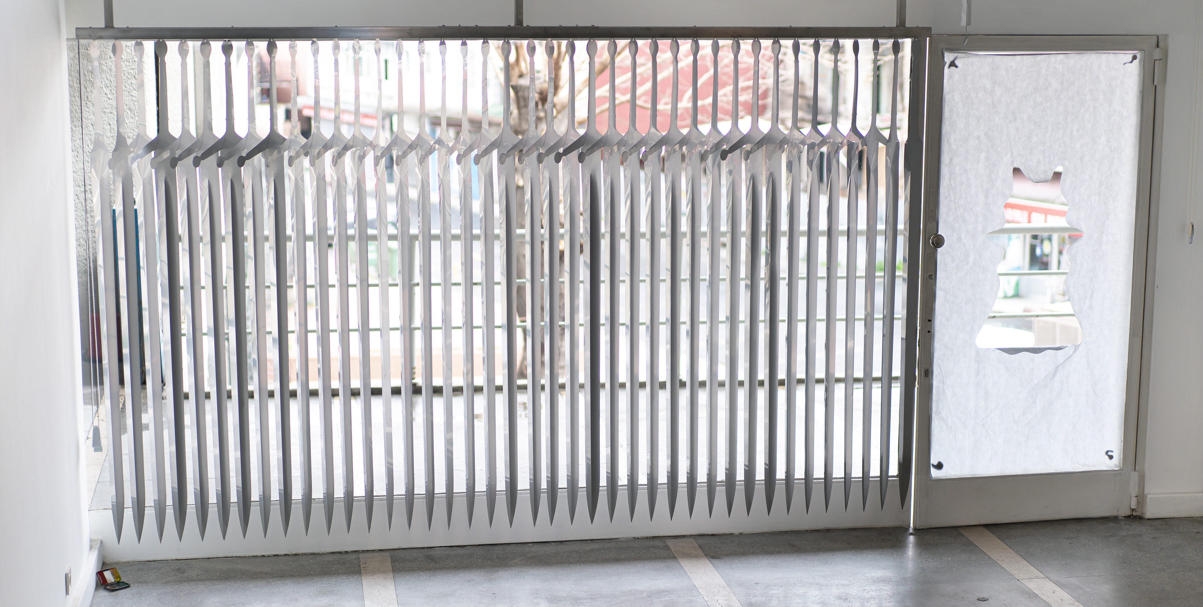 Weapon for Ephemeral Eyes, 2021. Laser-cut stainless steel, stainless profile, vertical blind mechanism, 310 x 25 x 250 cm