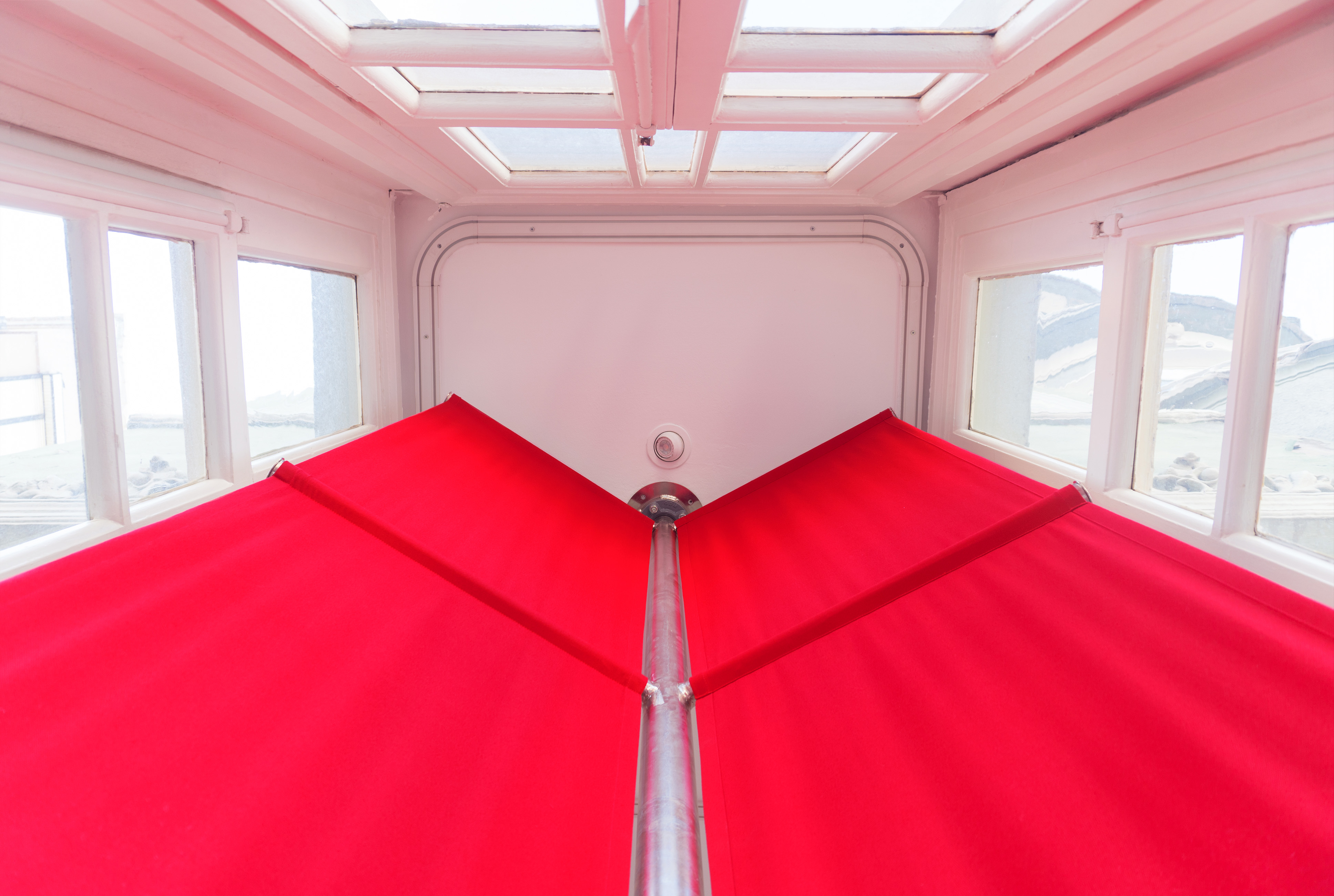 Curtain Closed, No More Stage, 2019. Fabric curtain, welded metal pipes, 90 x 90 x 280 cm