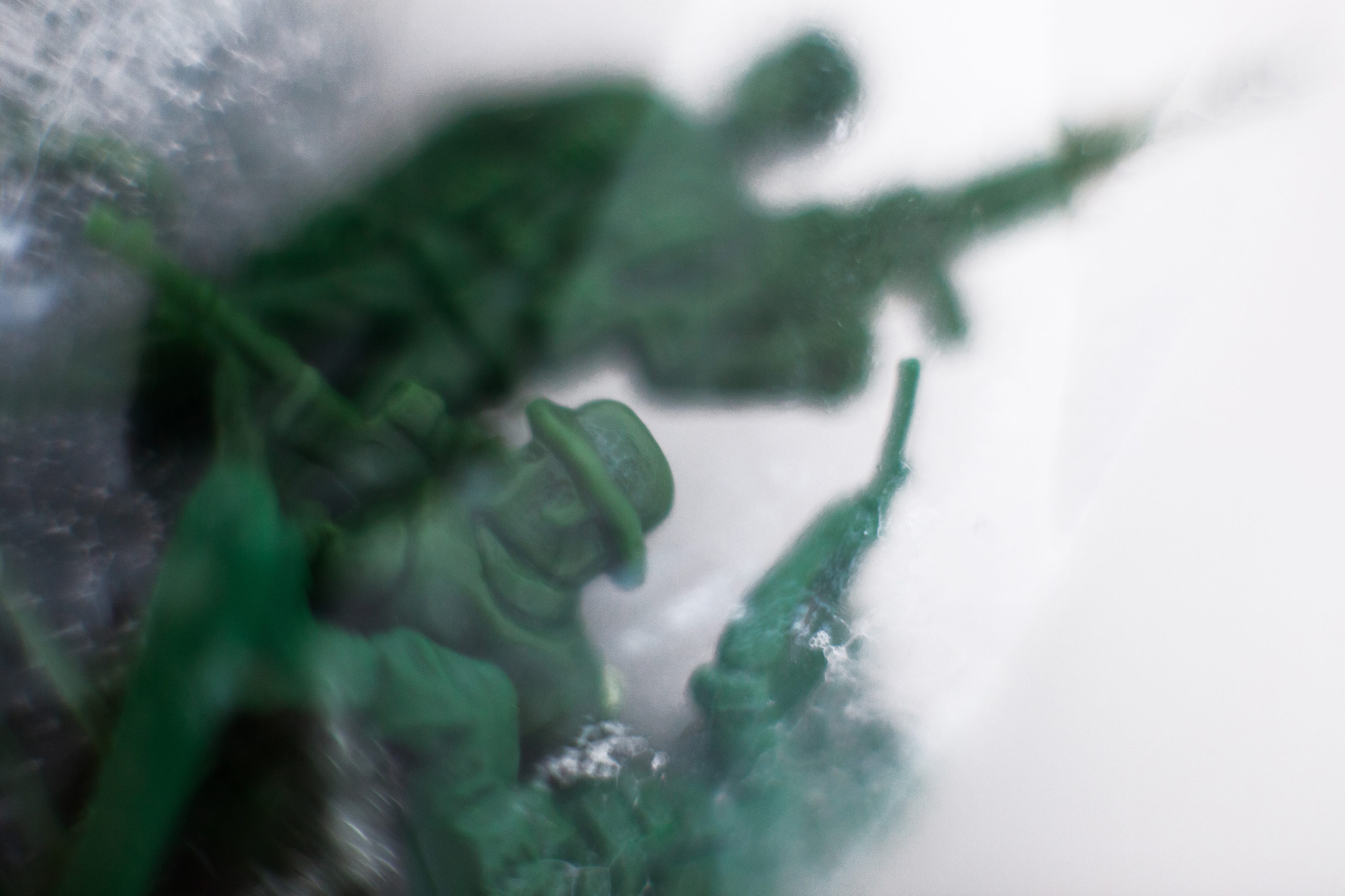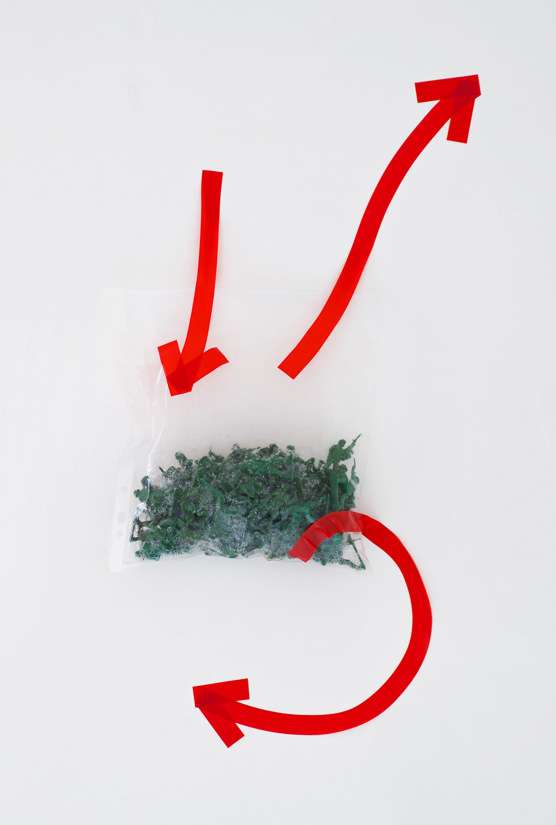 I Stepped On Snow, It Turned Grey, 2019. Toy soldier, shaving foam, sheet protector, tape, 34 x 52 cm