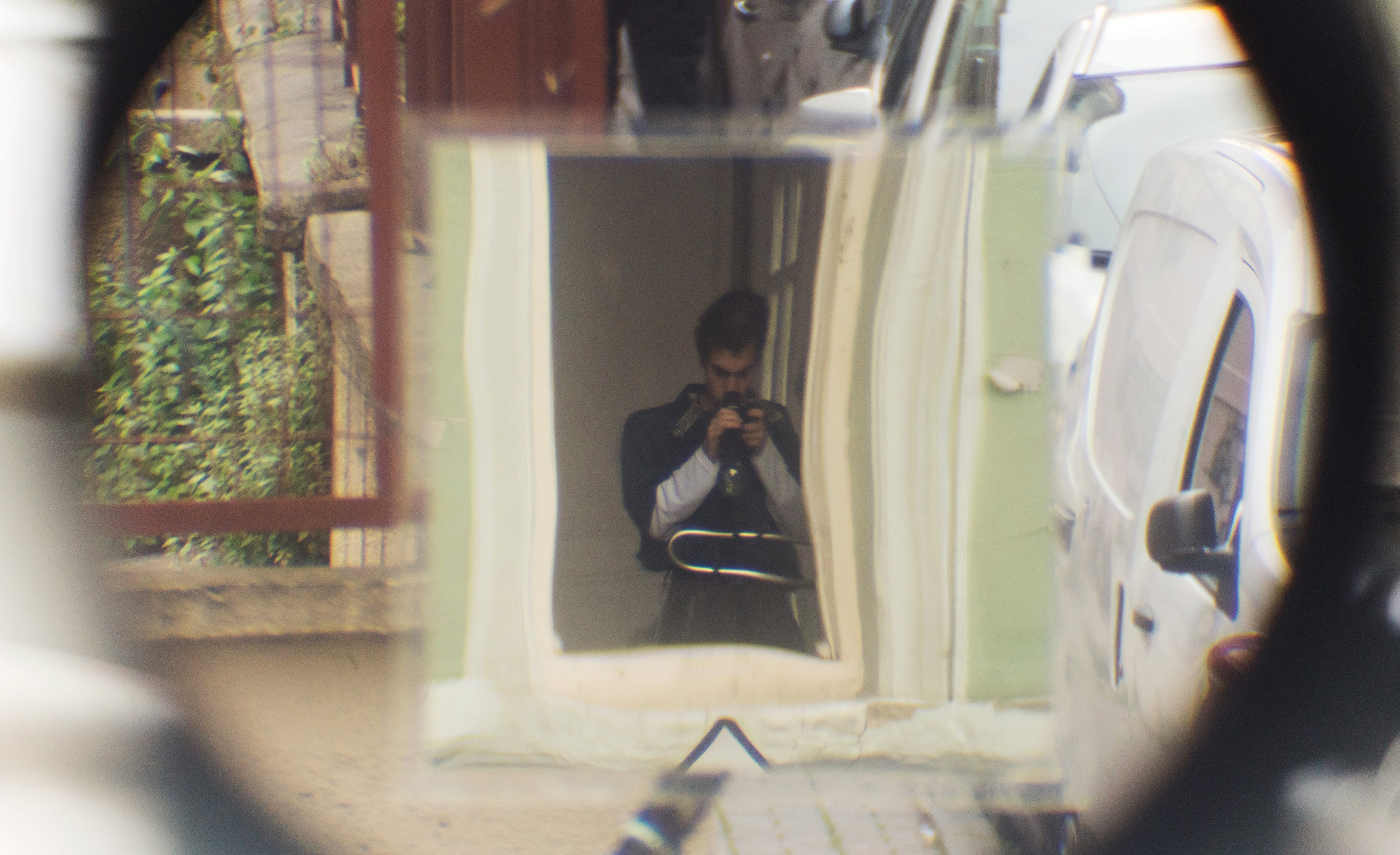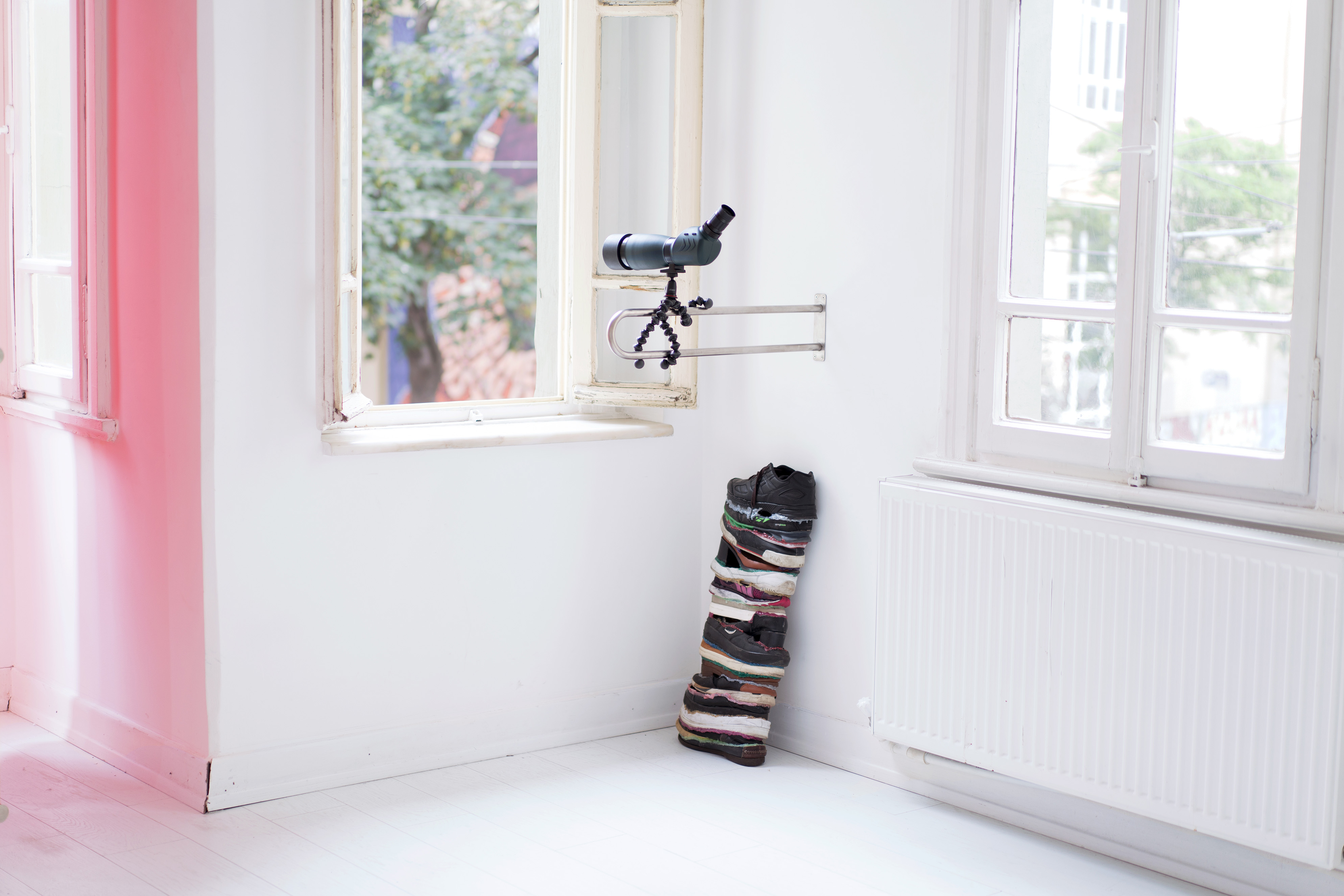 One eye open One eye closed, 2019. Spotting scope, gorillapod, mirror, stainless steel, 65 x 32 x 35 cm