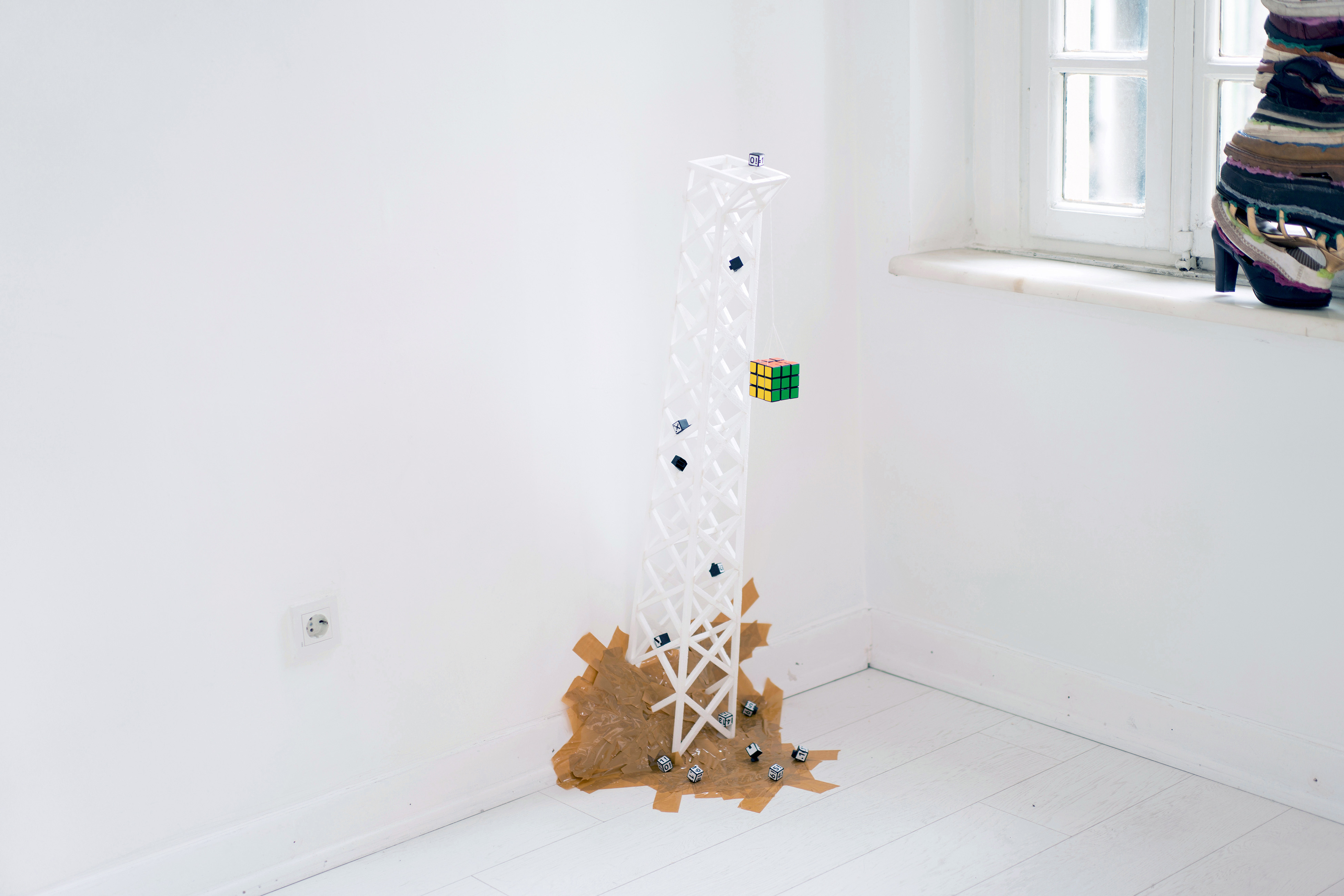 If I Know I Can't Use, 2019. Styrofoam, Rubik's cube, duck tape, 12 x 15 x 75 cm