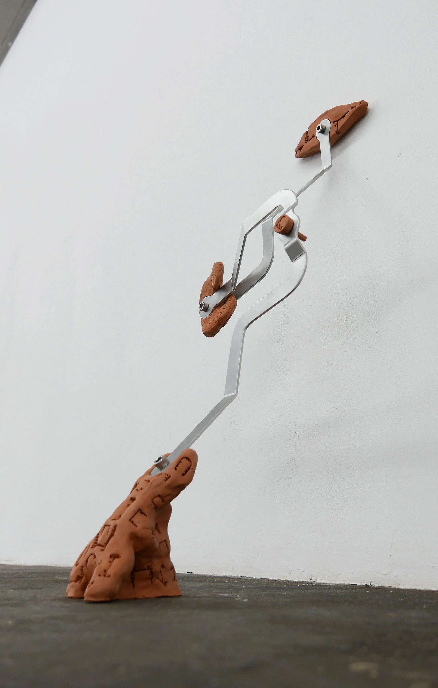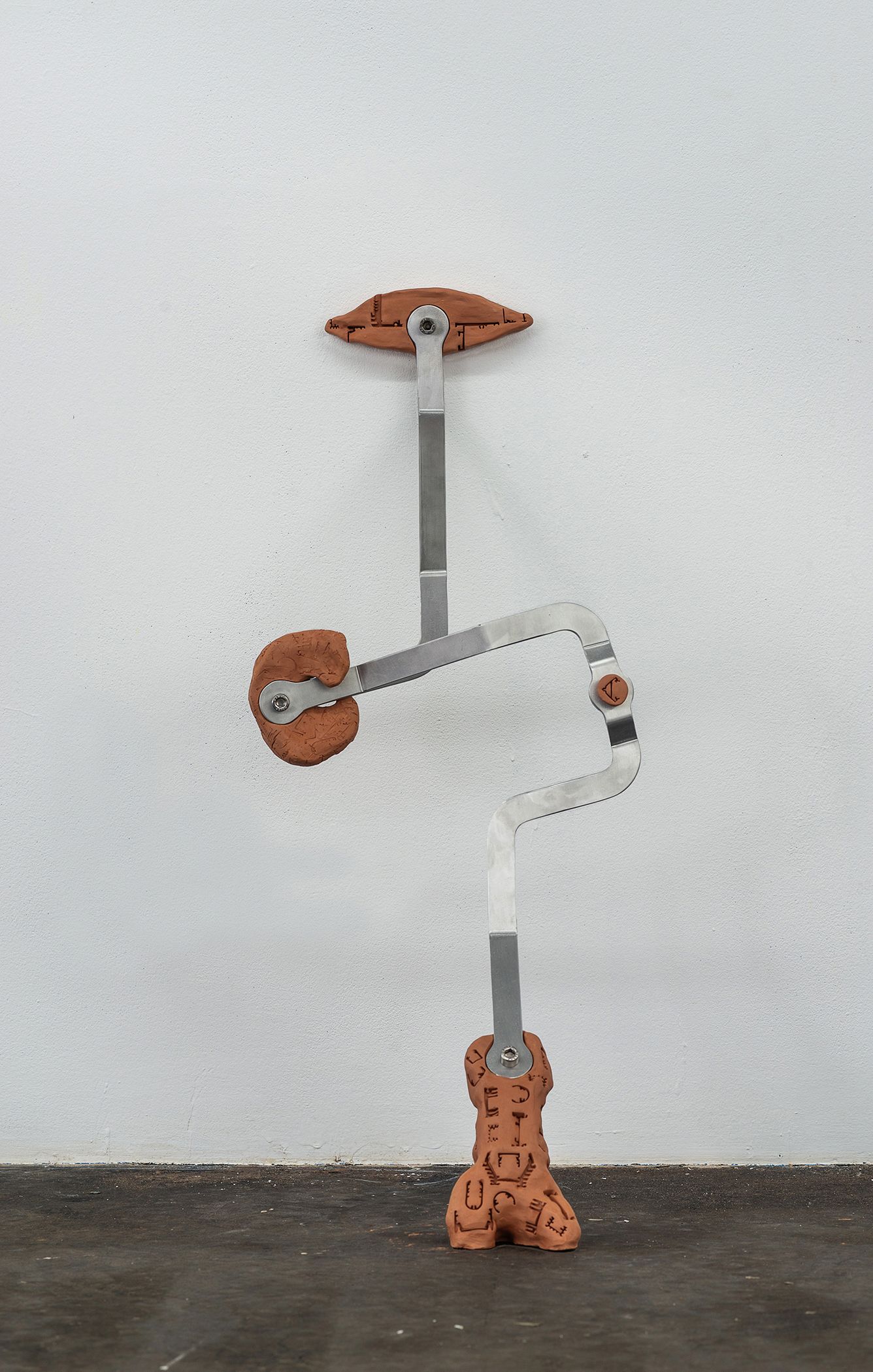 Pose B, 2022. Engraved air-dry clay, laser cut, and bent aluminum, imbus bolt, 40 x 20 x 65 cm