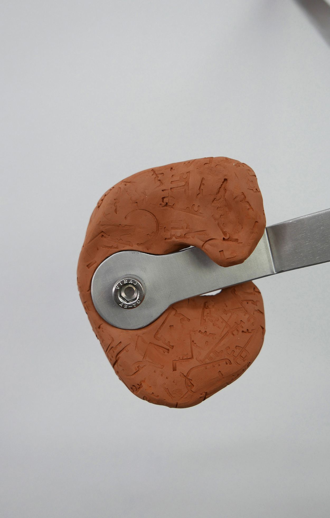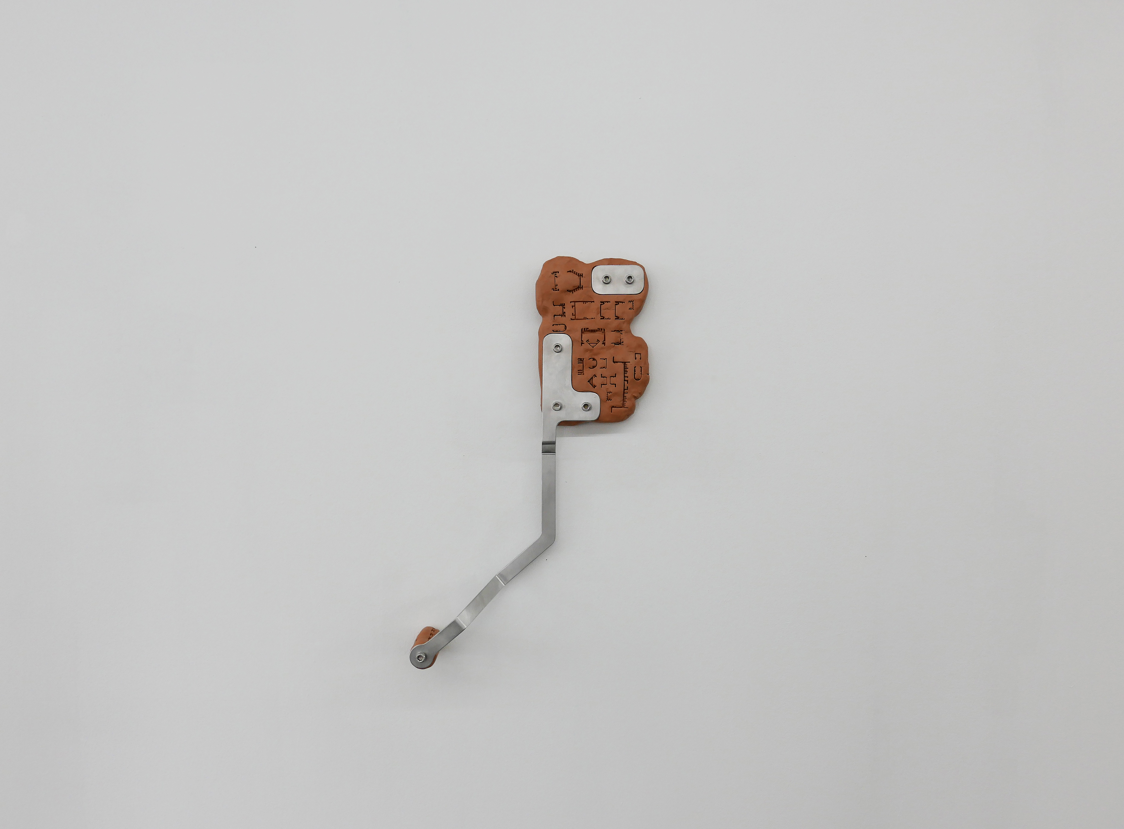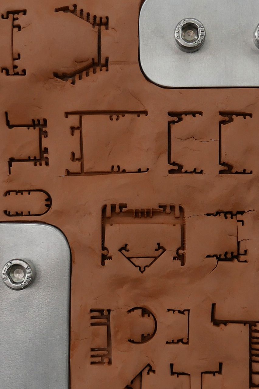 Pose A, 2022. Engraved air-dry clay, laser cut, and bent aluminum, imbus bolt, 45 x 11 x 70 cm