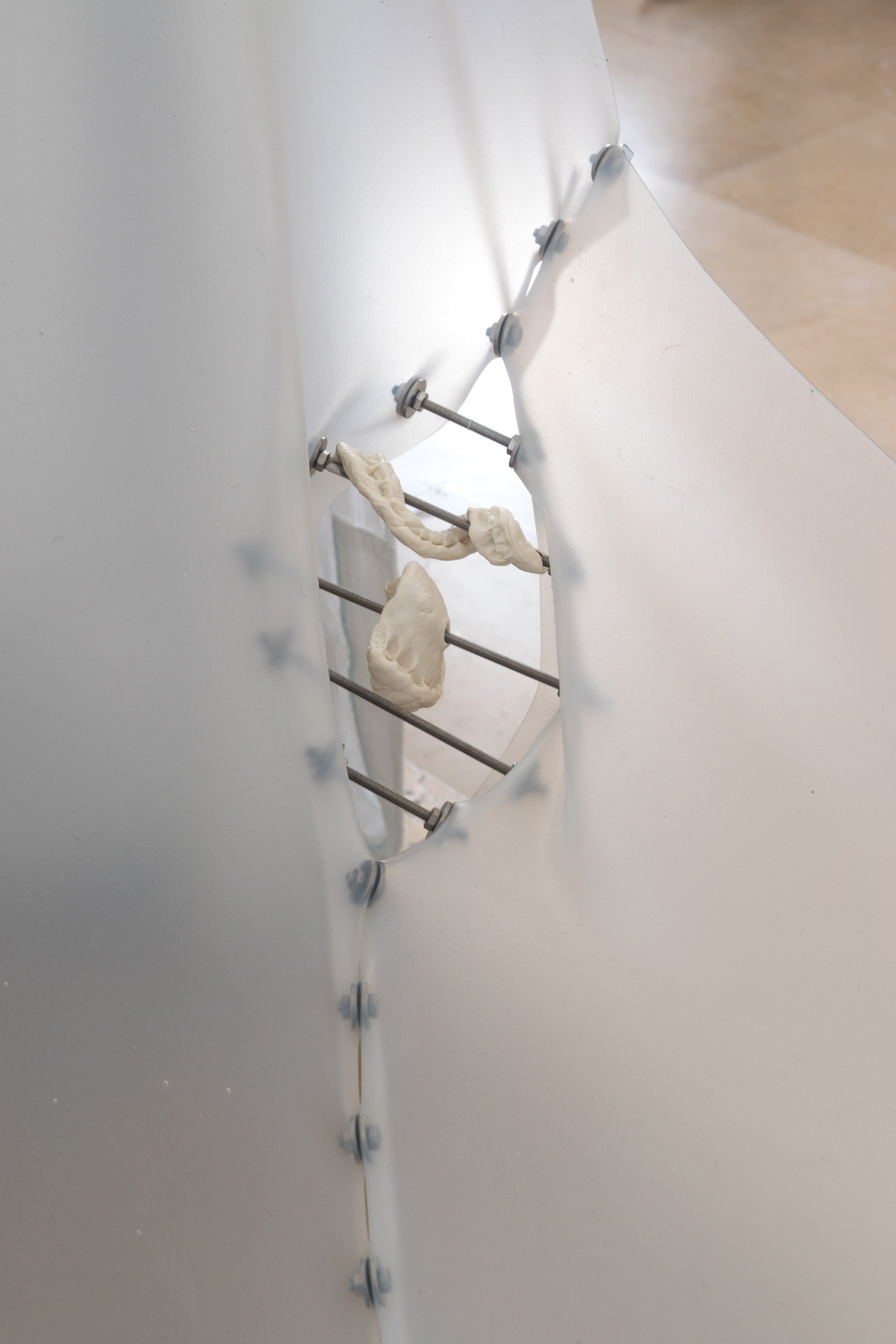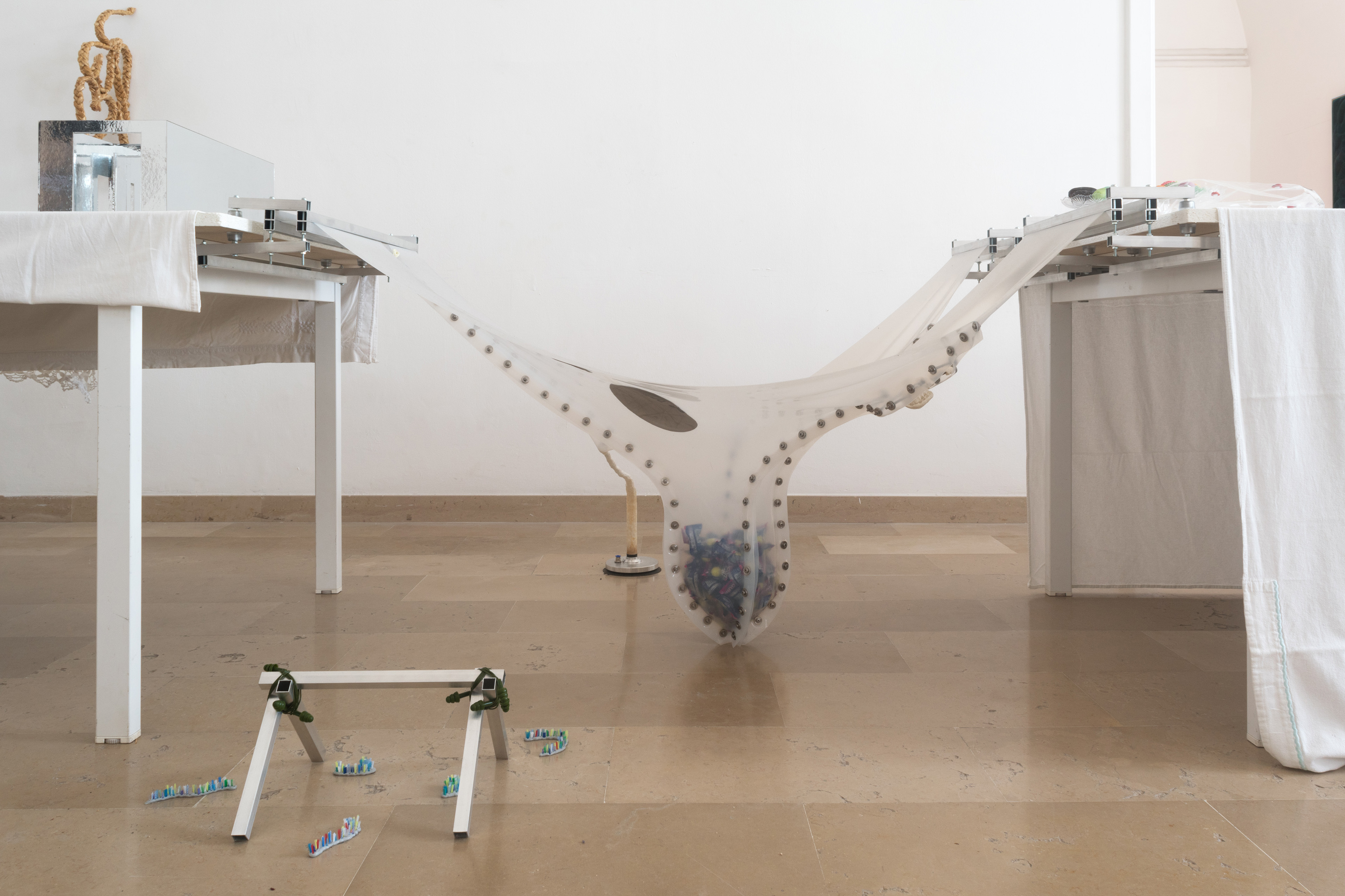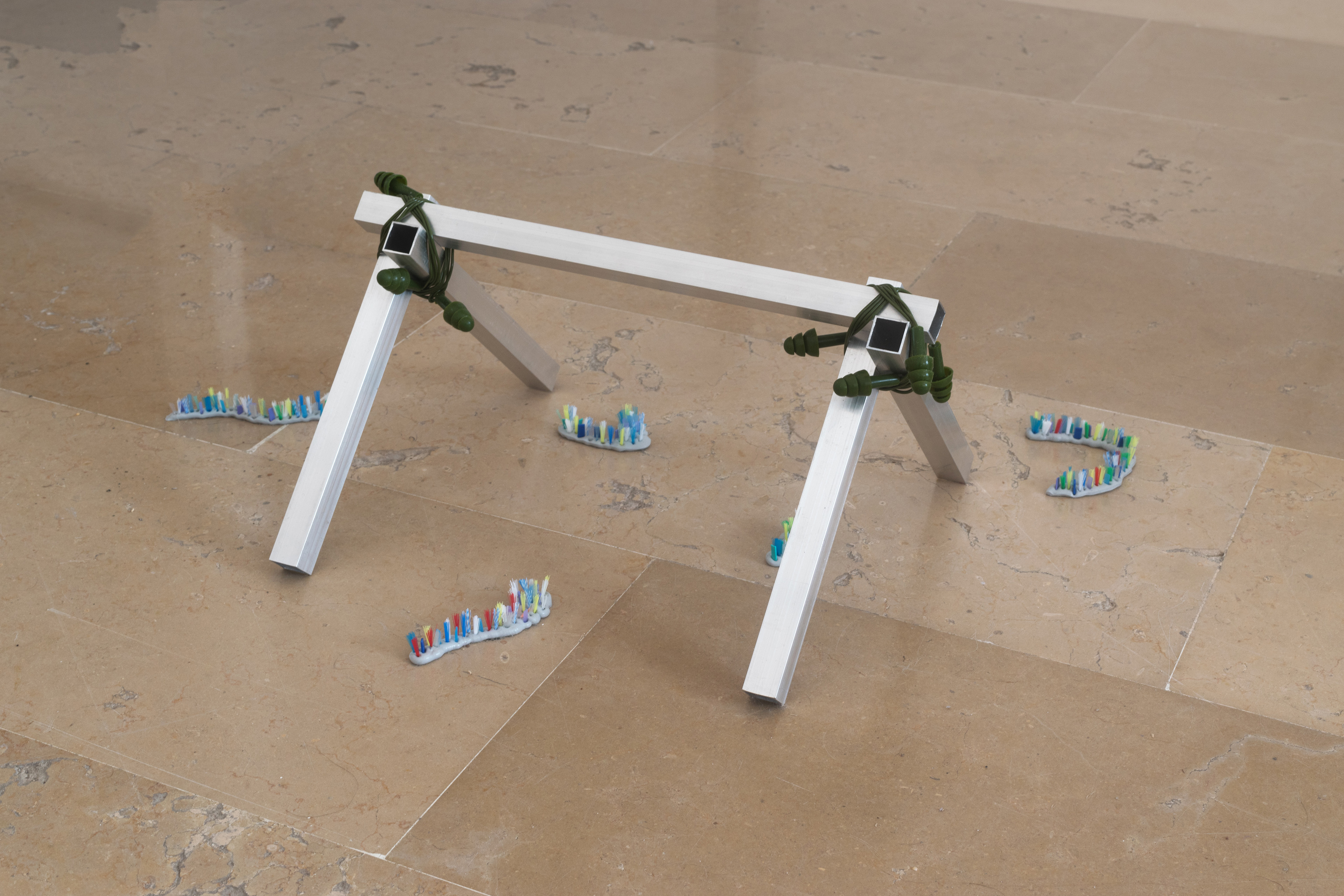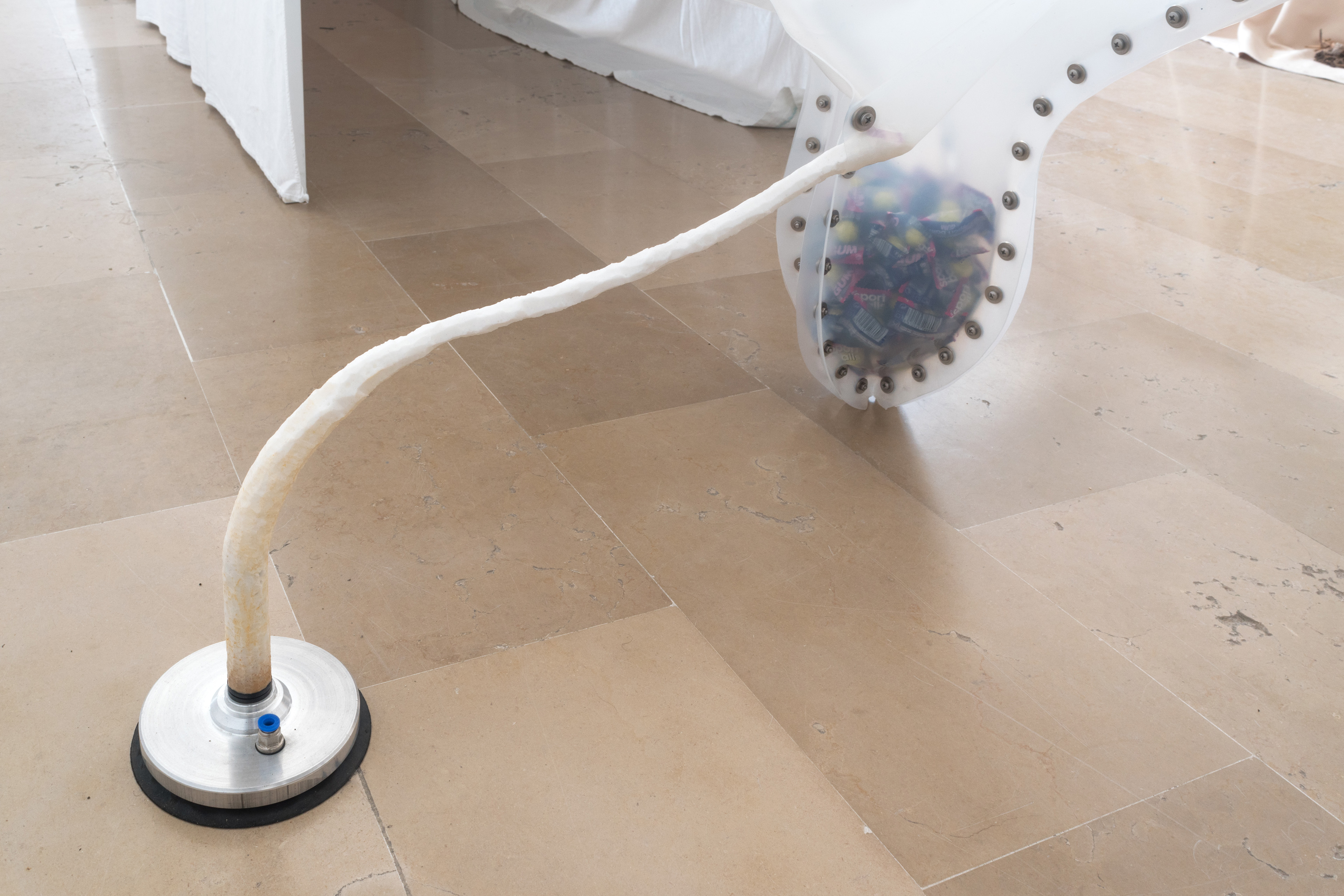 Dry Mouth (with Can Küçük) & Hunting Cabin, 2022. Molded silicone sheet, aluminum profile, chewing gum, sour gum, swimming cap, marble vacuum lifter, stone, bolts - military earplug, toothbrush fiber, silicone sealant, 140 x 70 x 70 cm