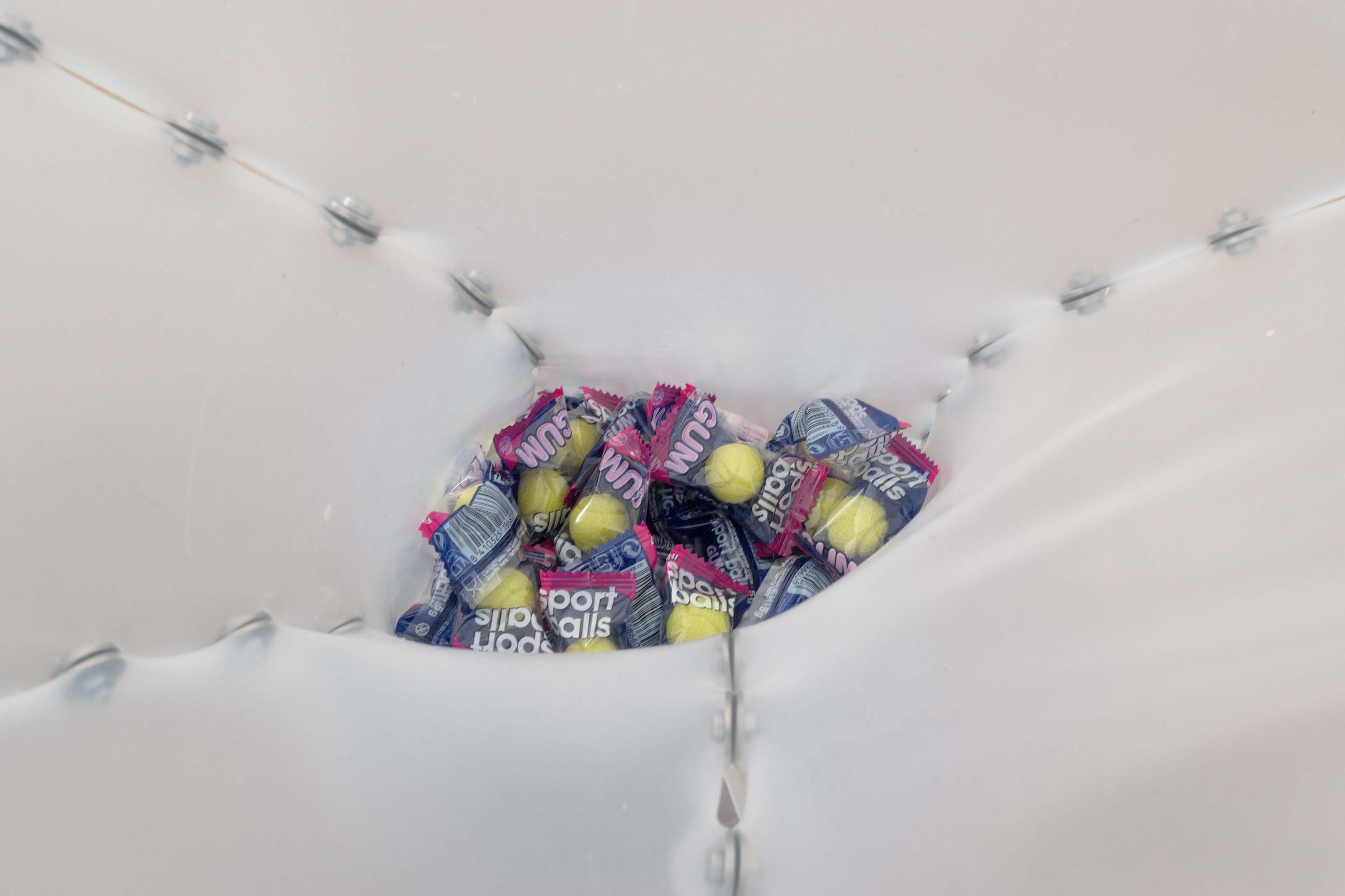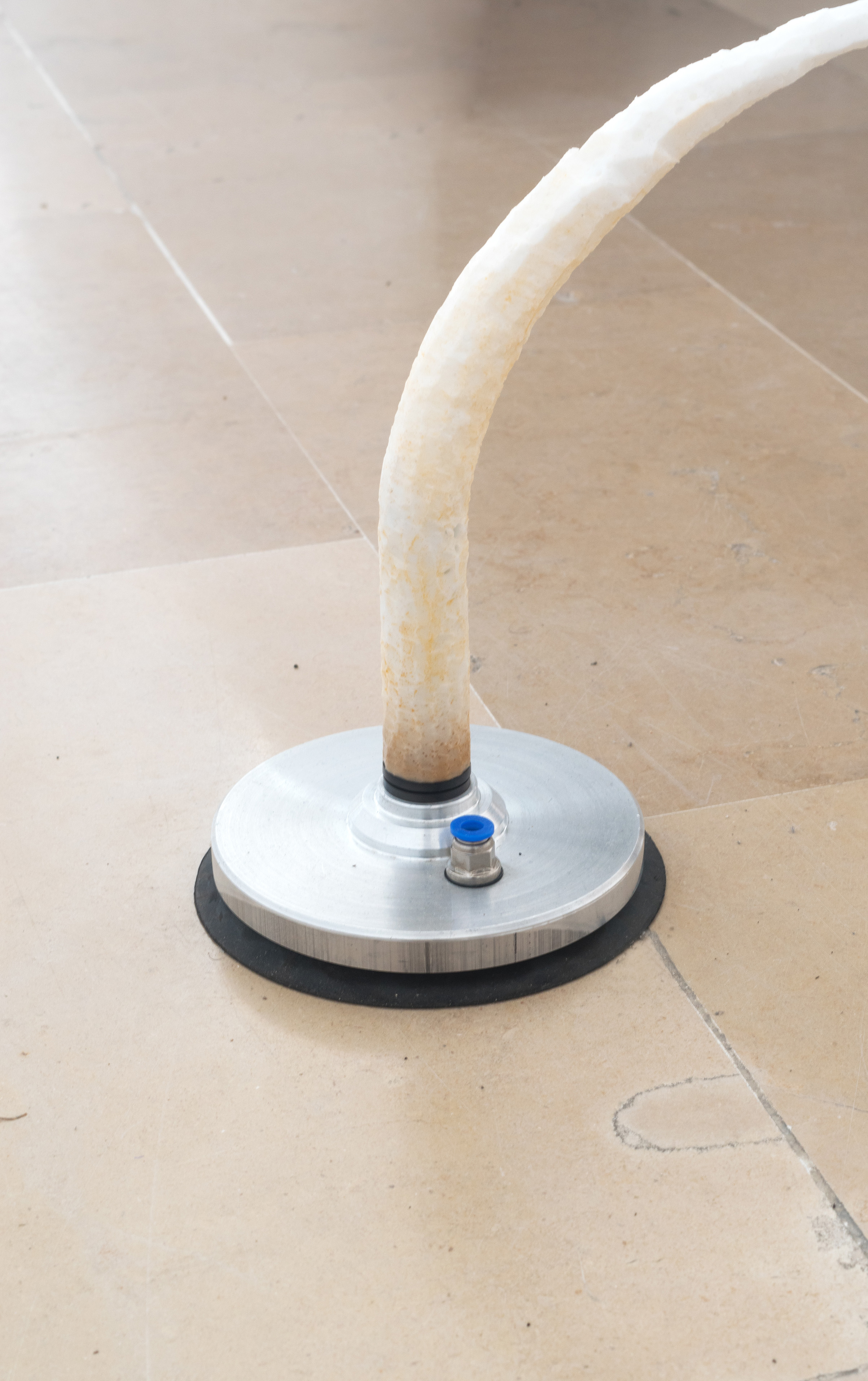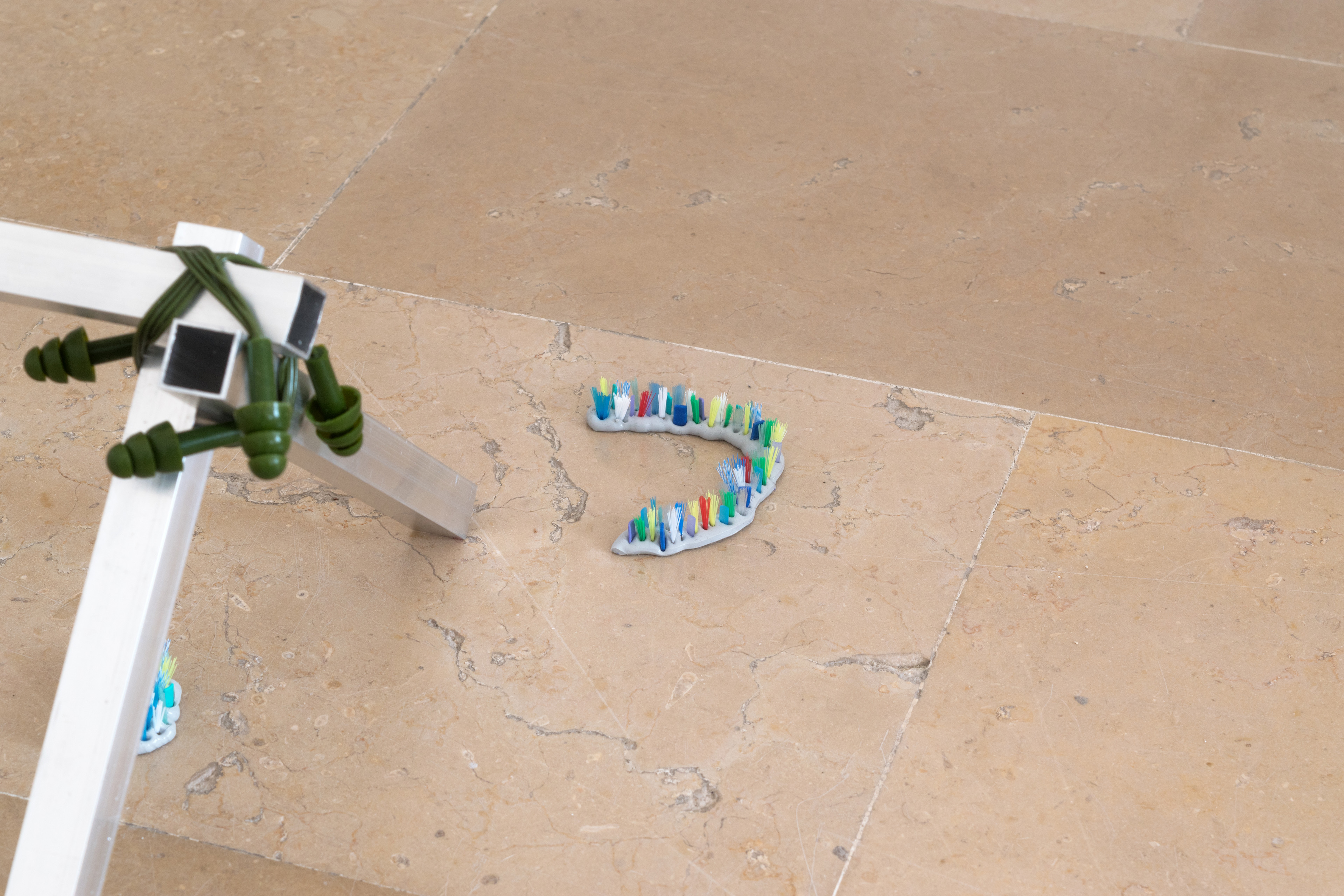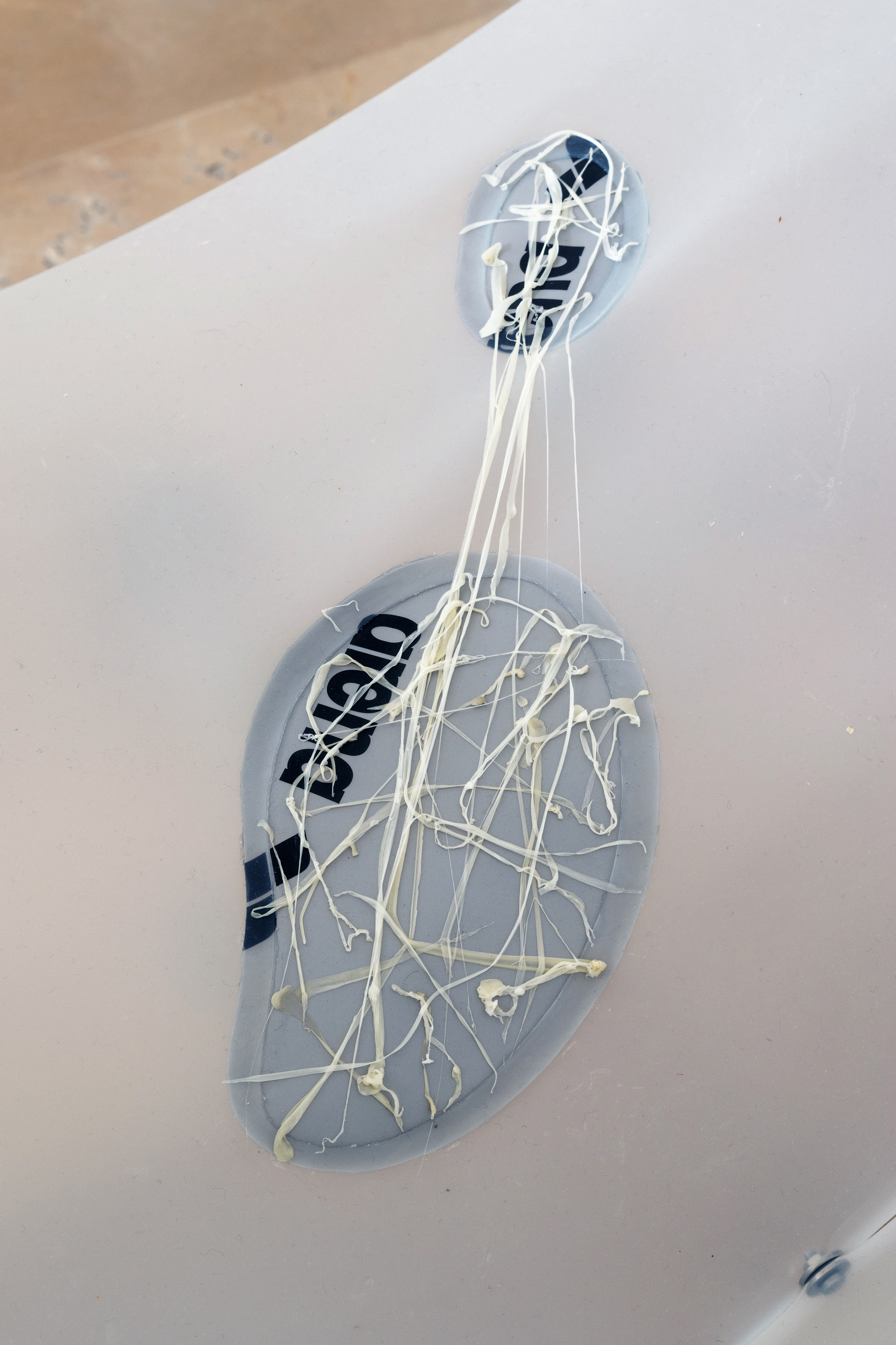 Dry Mouth (with Can Küçük) & Hunting Cabin, 2022. Molded silicone sheet, aluminum profile, chewing gum, sour gum, swimming cap, marble vacuum lifter, stone, bolts - military earplug, toothbrush fiber, silicone sealant, 140 x 70 x 70 cm
