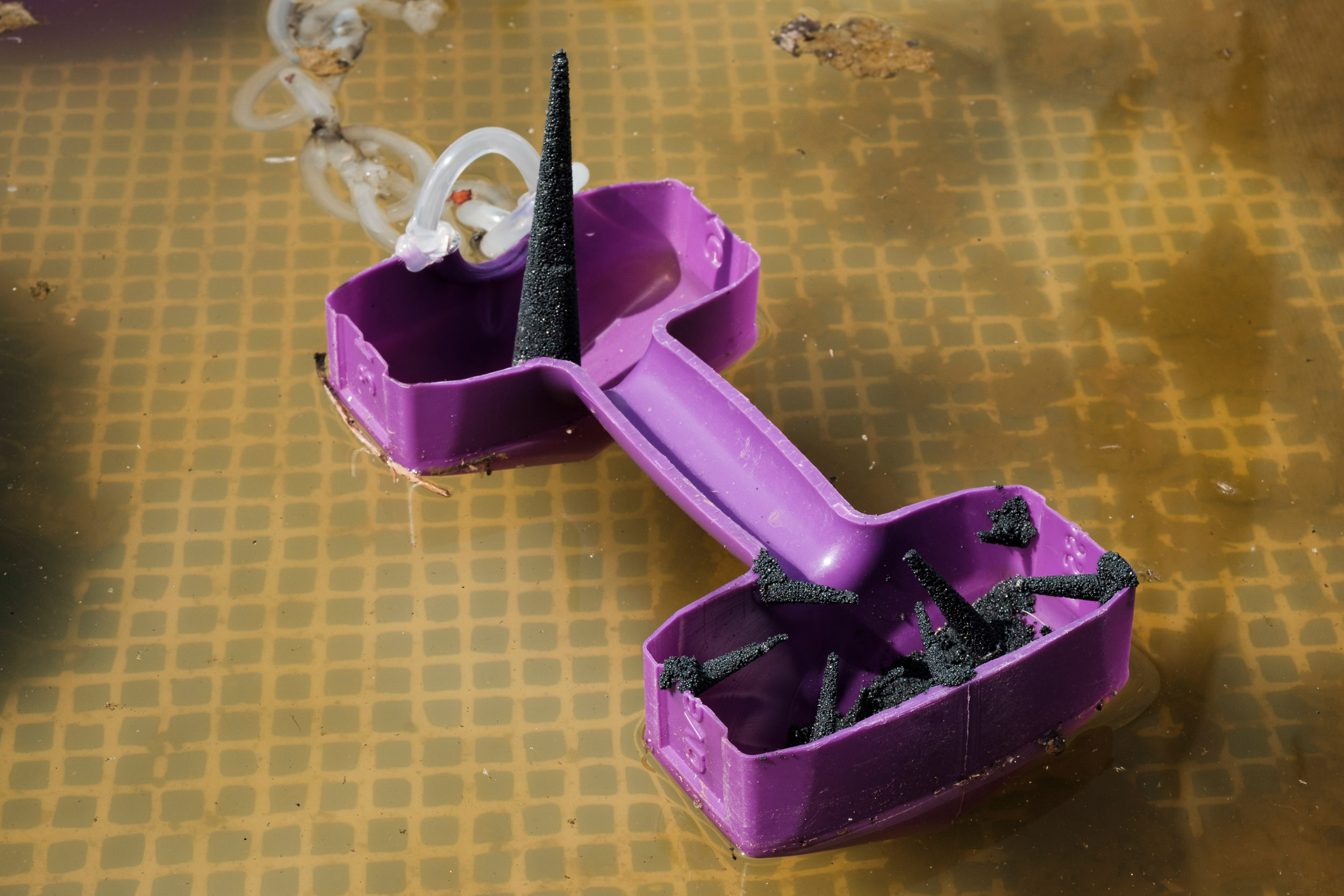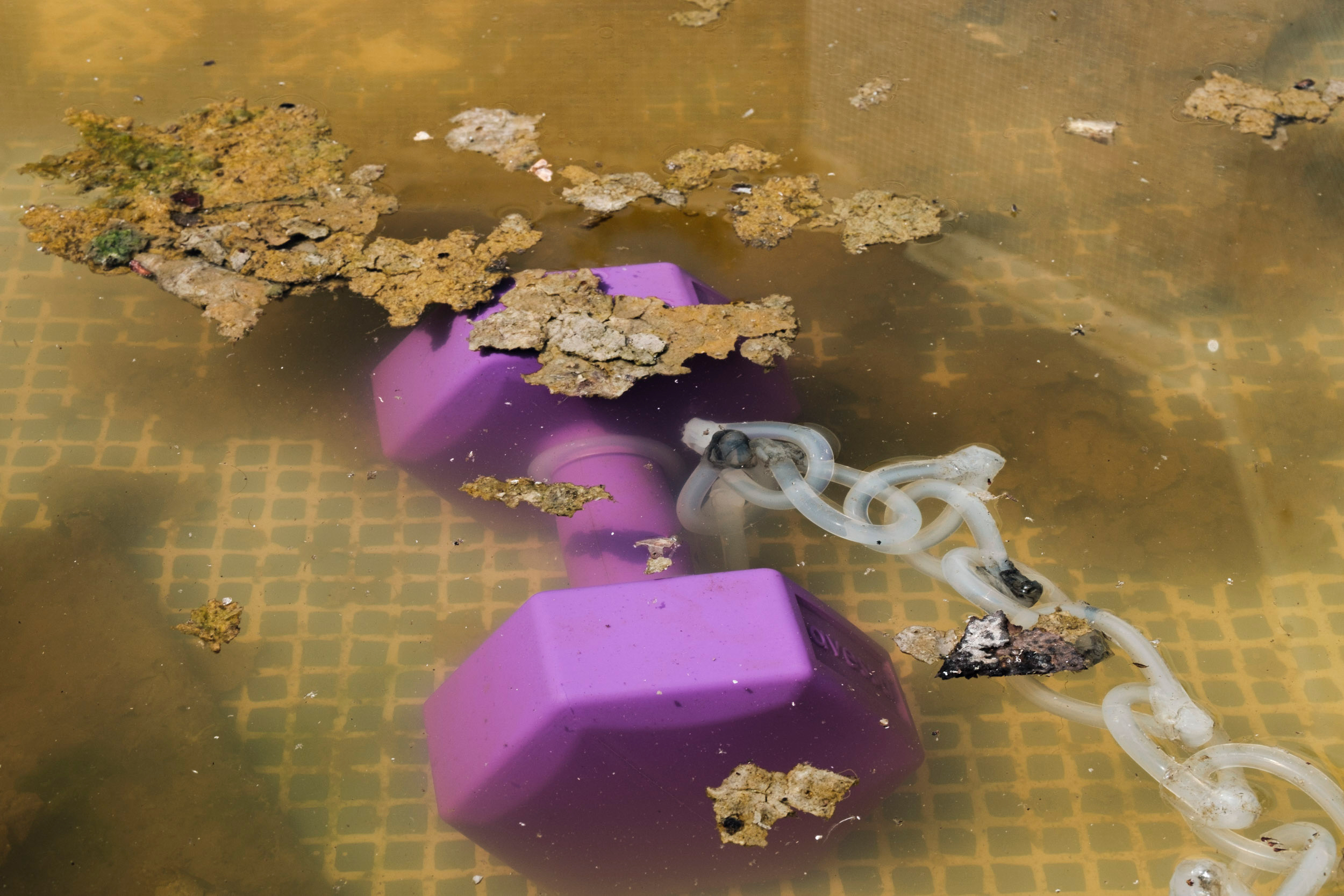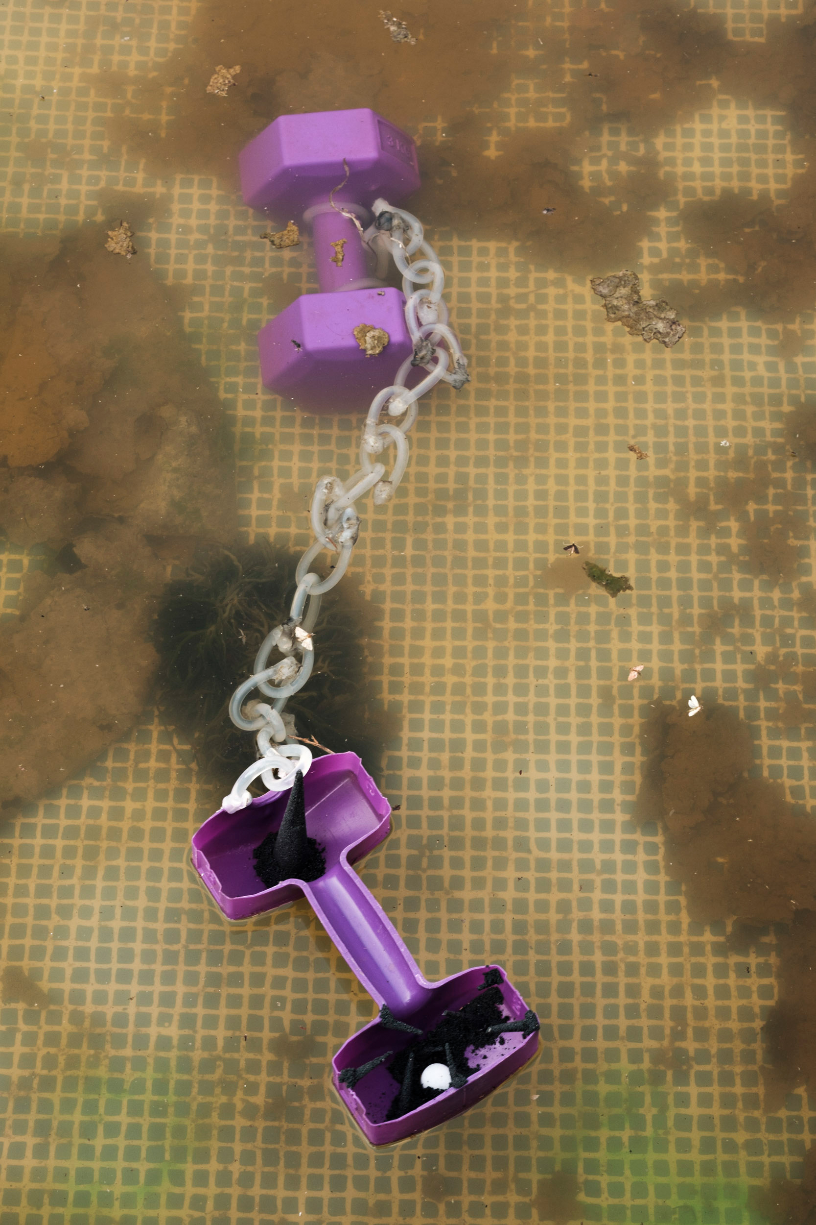 Untitled 3, 2021. Plastic dumbbell, industrial dust, chlorine tablet, silicon glue stick, (x2) 22 x 10 x 10 cm