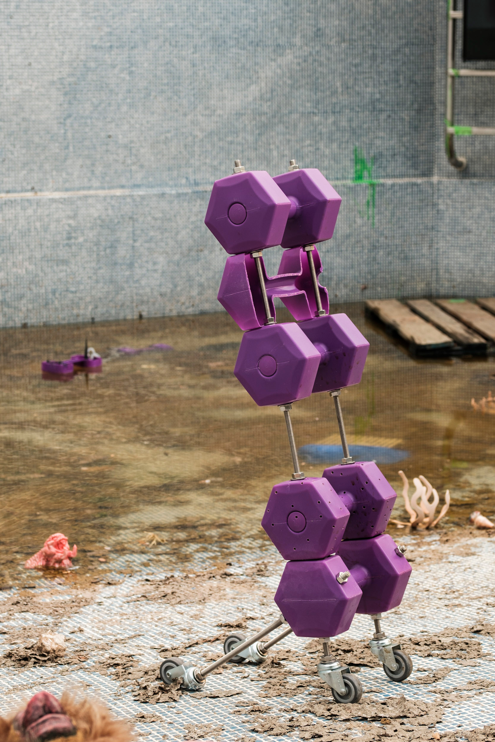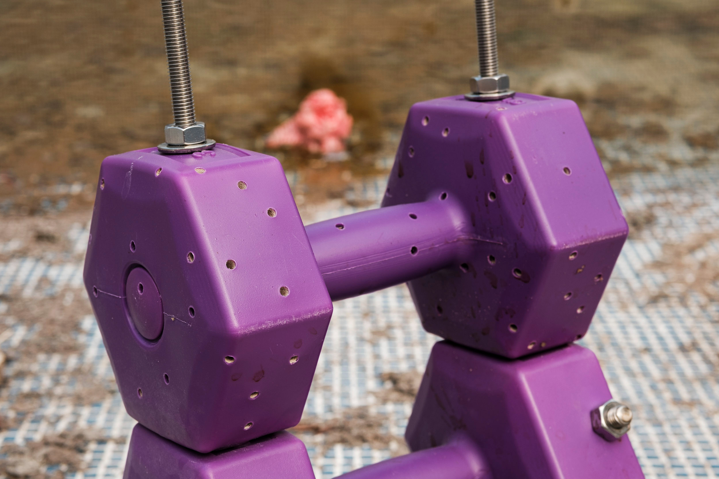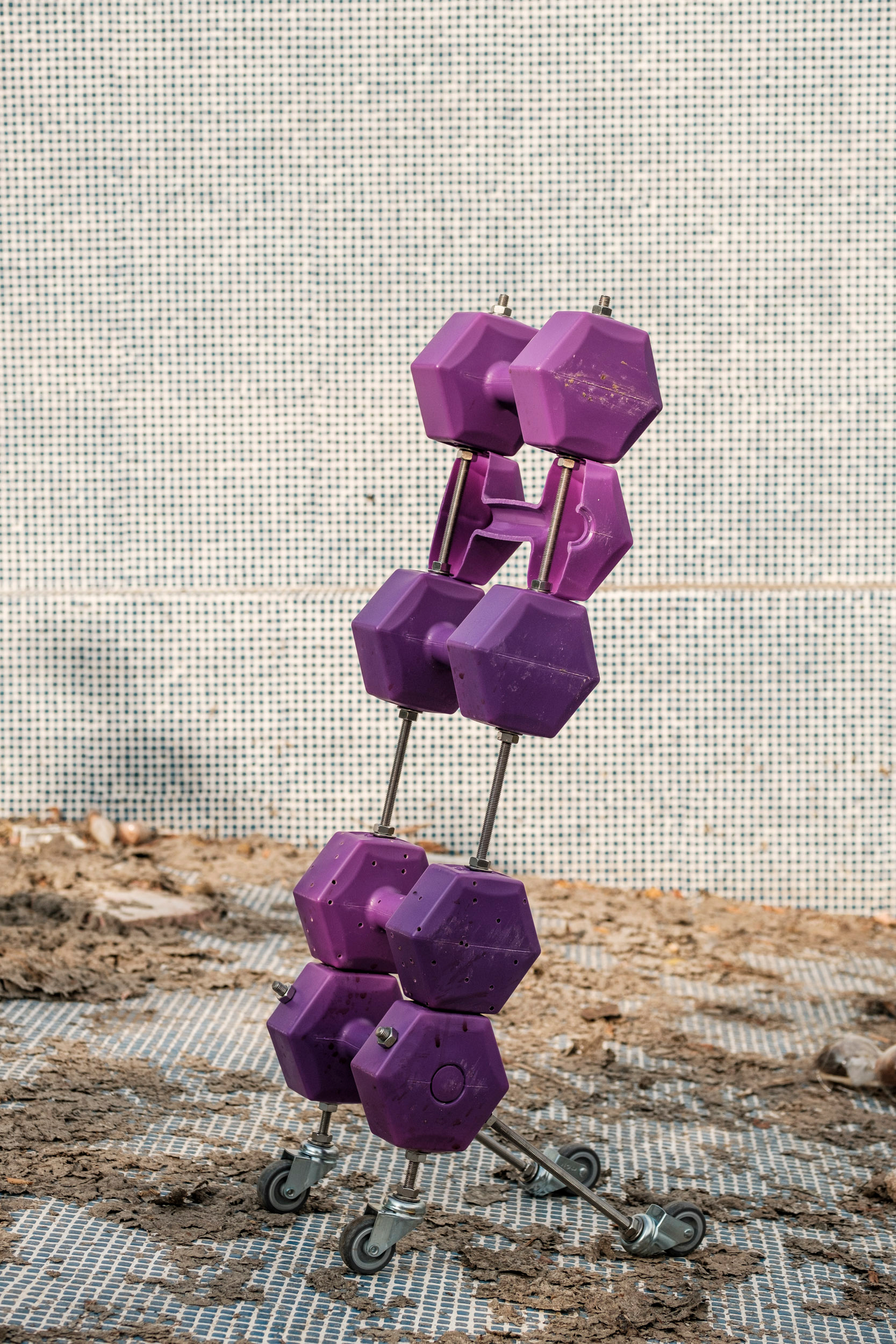 Untitled 1, 2021. Plastic dumbbell, sand, industrial dust, stainless threaded rod, transport wheel, 30 x 45 x 70 cm